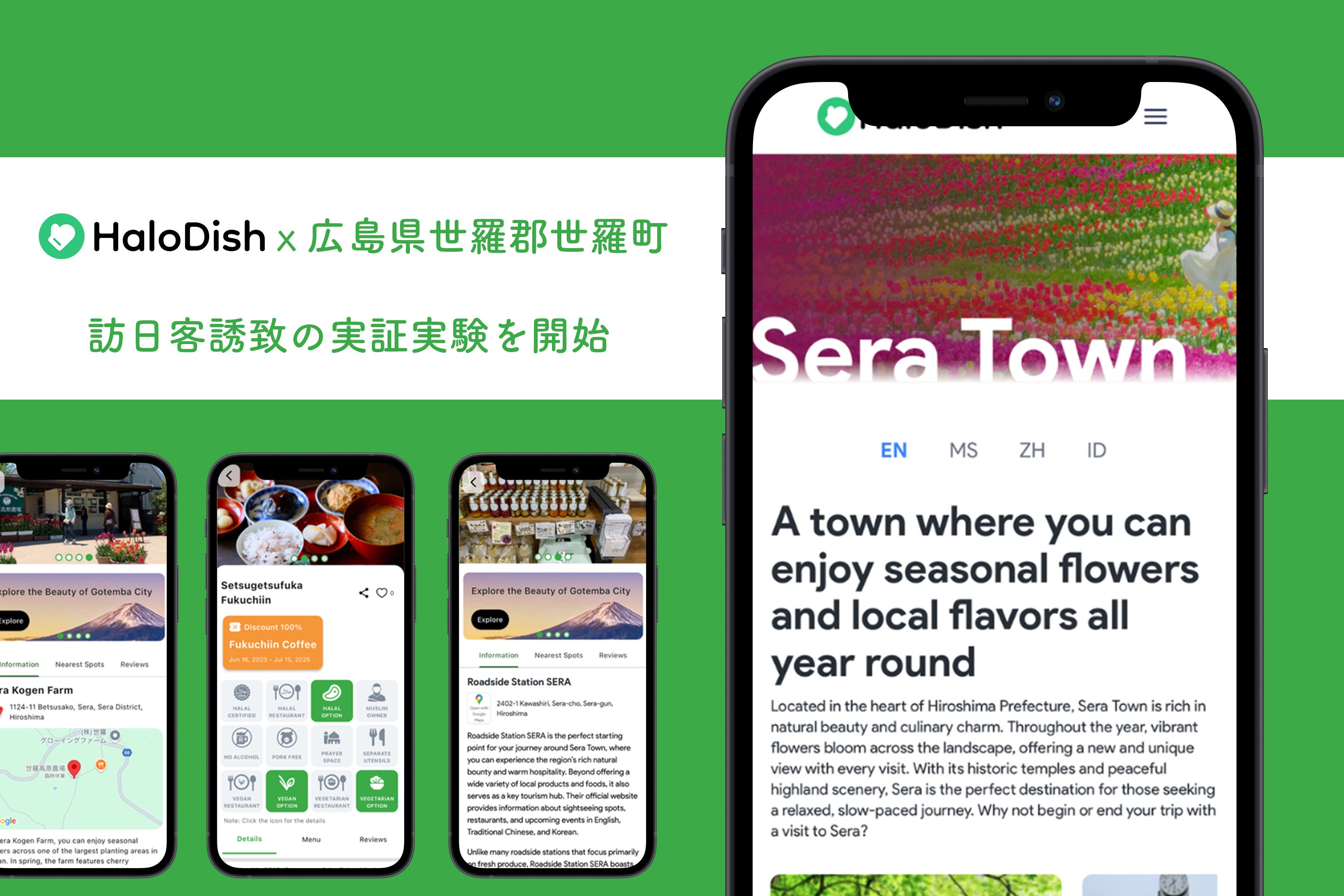 Halal&Veganライフスタイルのフレンドリーなパートナー「HaloDish」を提供する株式会社eftax(本社:兵庫県尼崎市、代表:中井 友昭)は、広島県世羅郡世羅町のインバウンド客誘致に向けた実証実験の一貫で町と連携し地域の魅力を発信するコンテンツをHaloDishに追加しました。町の観光交流課をはじめ、花観光農園や町内の飲食店、観光施設の関係者様にご協力いただき、特集ウェブページや多言語での情報発信コンテンツを公開しました。