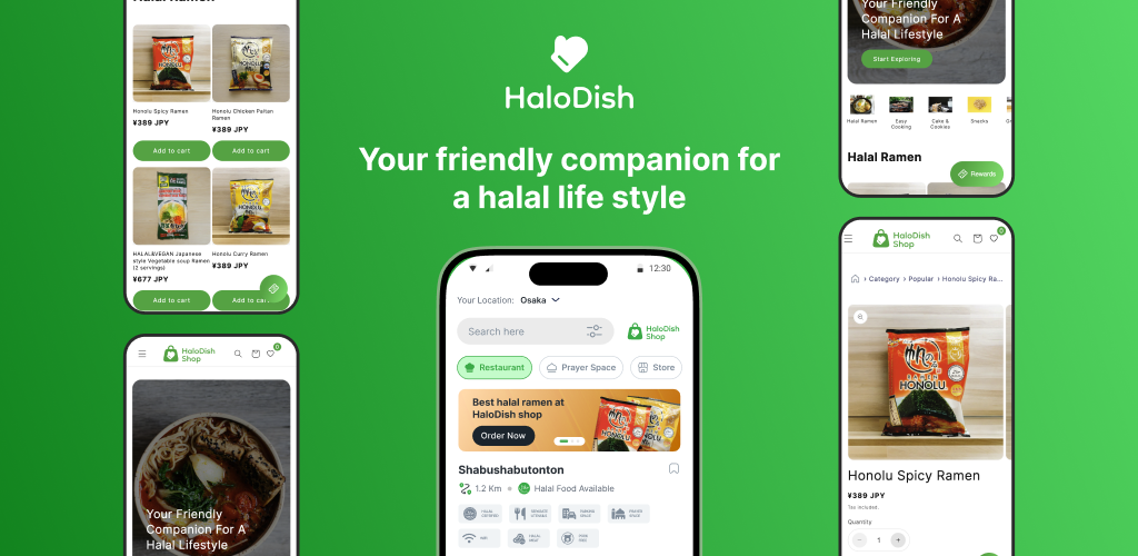 HaloDish(ハロディッシュ)は、飲食店に関する広範なデータ(営業時間・場所・ハラール認証・ムスリム/ベジタリアン/ヴィーガン対応メニューなど)、礼拝スペースの場所、ムスリム・ベジタリアン・ヴィーガン向け商品取り扱い店などの情報を提供しているサービスです。ユーザー自身がカスタマイズできるフィルター機能を搭載しており、好みや食の価値観に合った検索ができることが特徴。そのほかにも、食品表示にかざすだけでハラール・ヴィーガンかどうかを確認できるハラールチェッカー・ヴィーガンチェッカー、オンラインショップなど、日常生活のさまざまな側面で利便性を届けています。