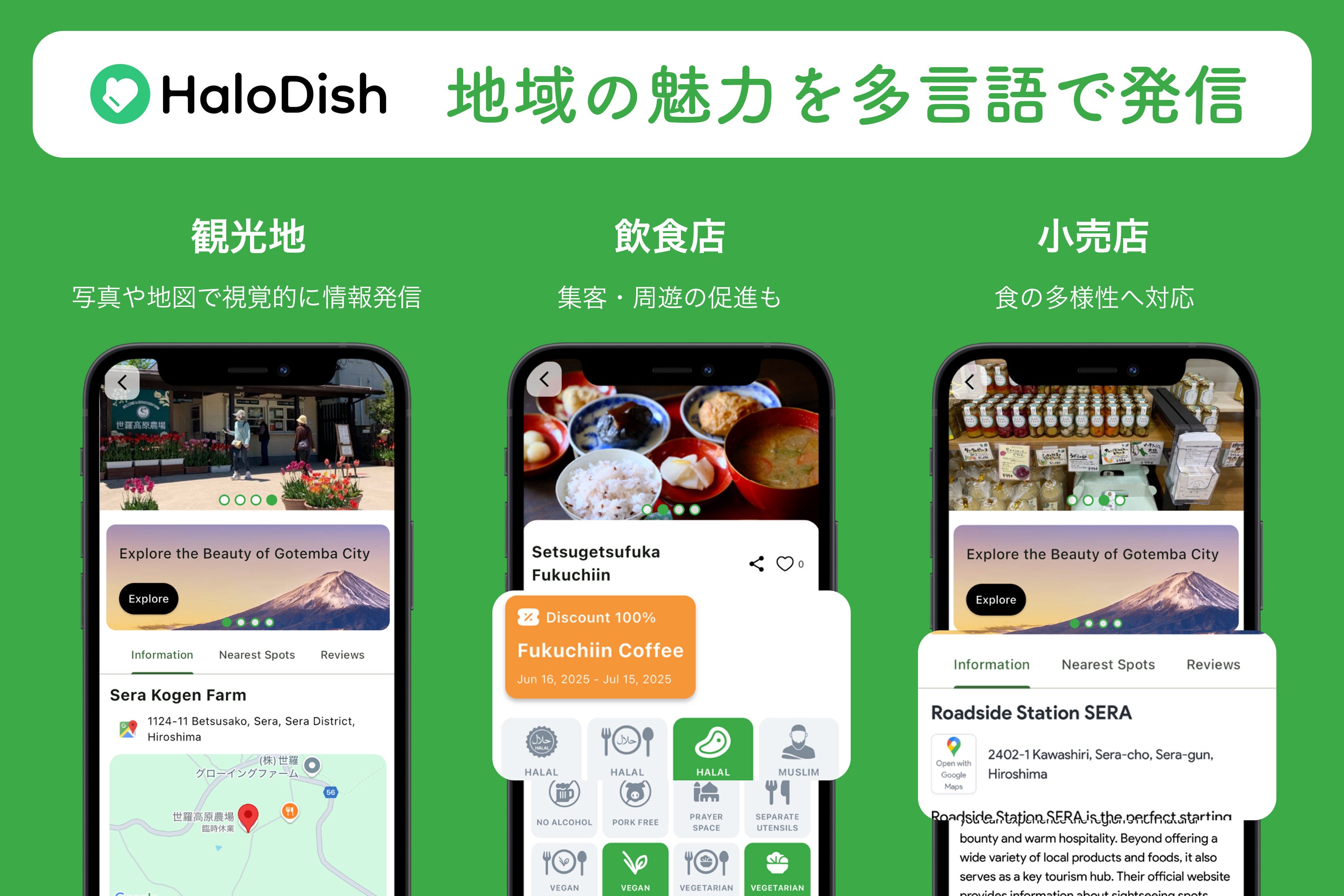 インバウンド需要への施策を打ちたい、ムスリム/ベジタリアン/ヴィーガン向けに情報を発信したいという自治体の皆様はぜひHaloDishカスタマーサポートへお声がけください。