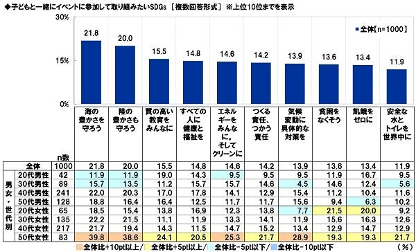 男女・世代別にみると、50代女性では「海の豊かさを守ろう」が39.8%、「陸の豊かさも守ろう」が38.6%、「エネルギーをみんなに。そしてクリーンに」が25.3%、「気候変動に具体的な対策を」が28.9%と、親子でのSDGsイベント参加に対する前向きな姿勢が際立つ結果となりました。