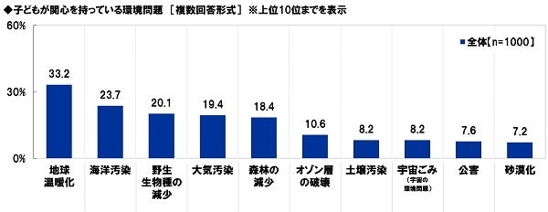 - 子どもが関心を持っている環境問題 1位「地球温暖化」2位「海洋汚染」3位「野生生物種の減少」