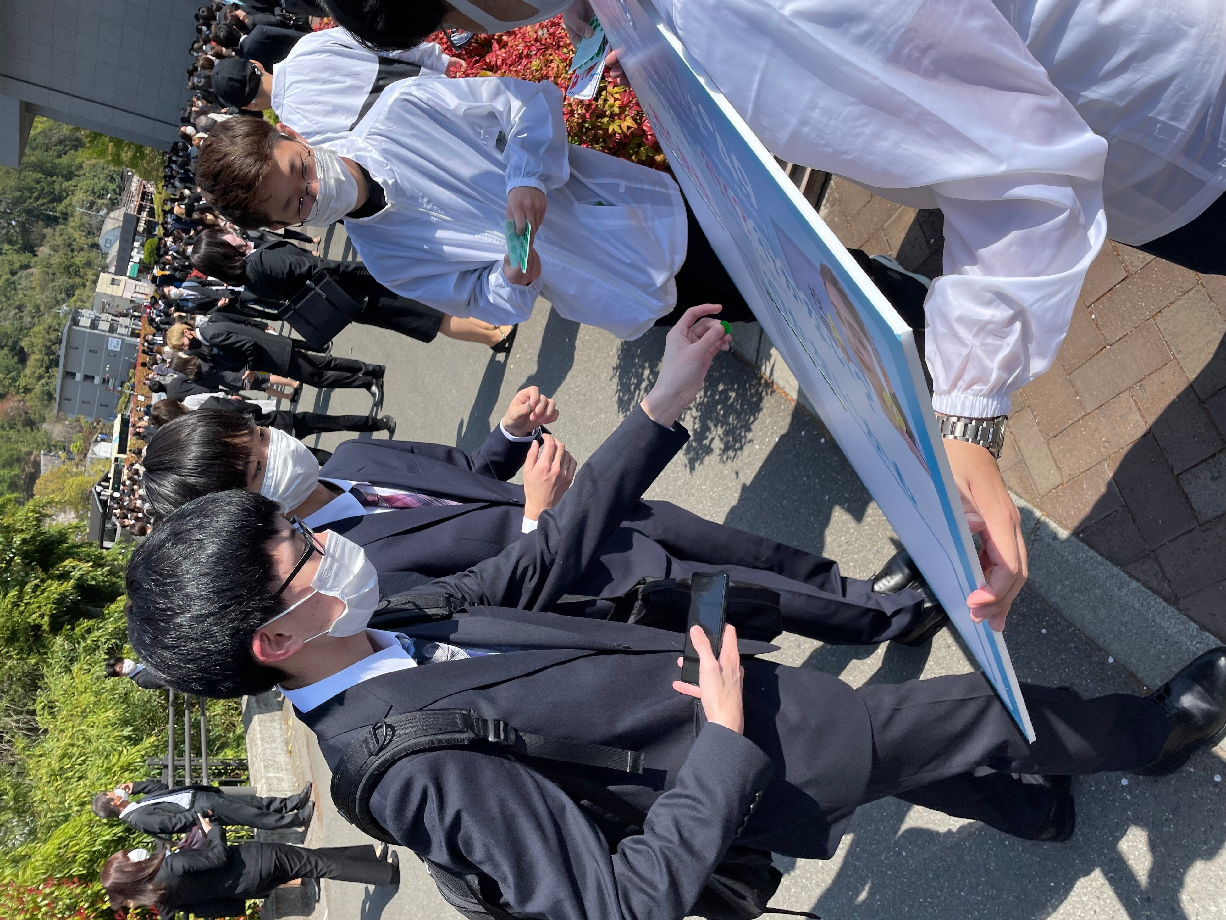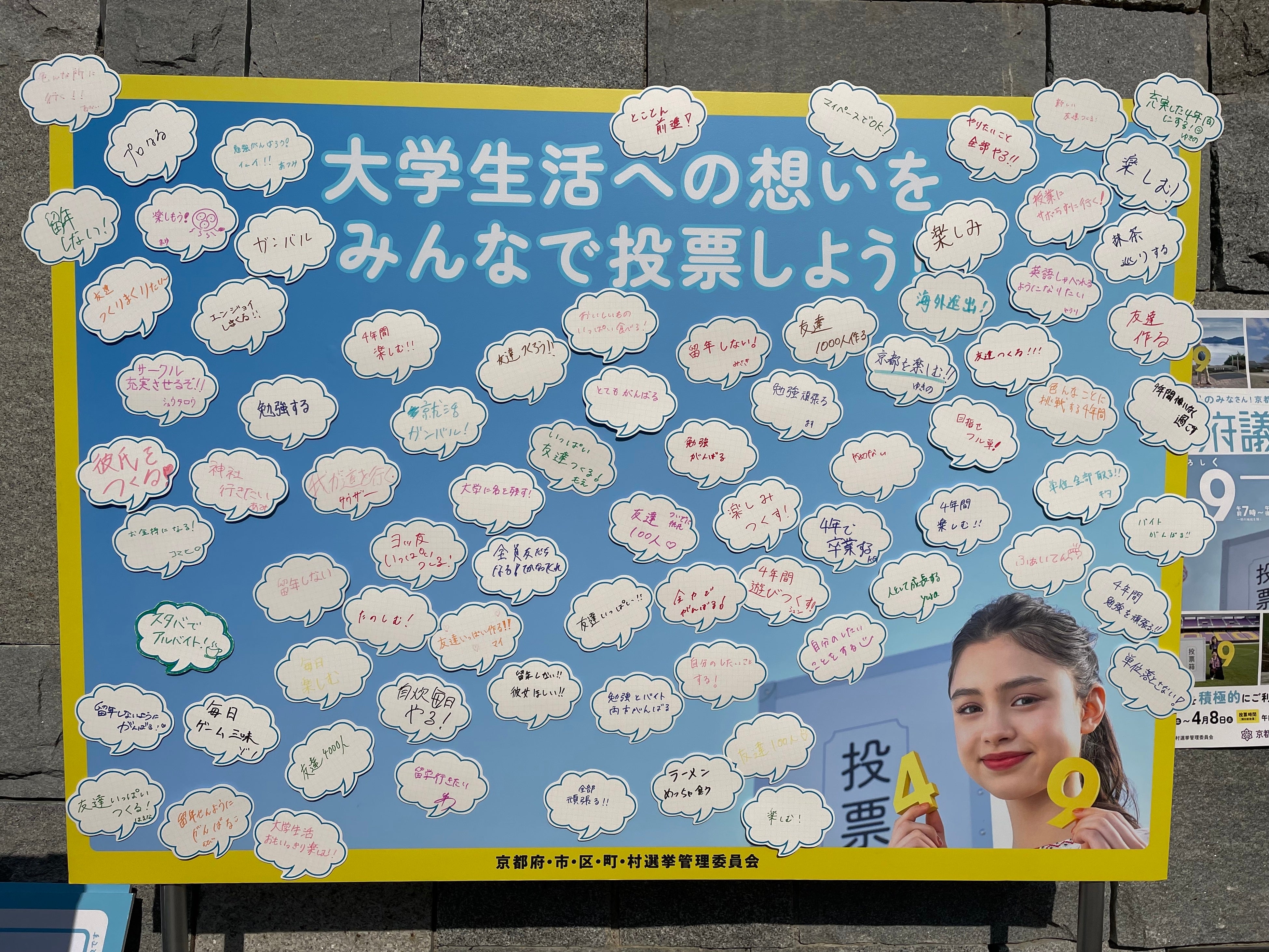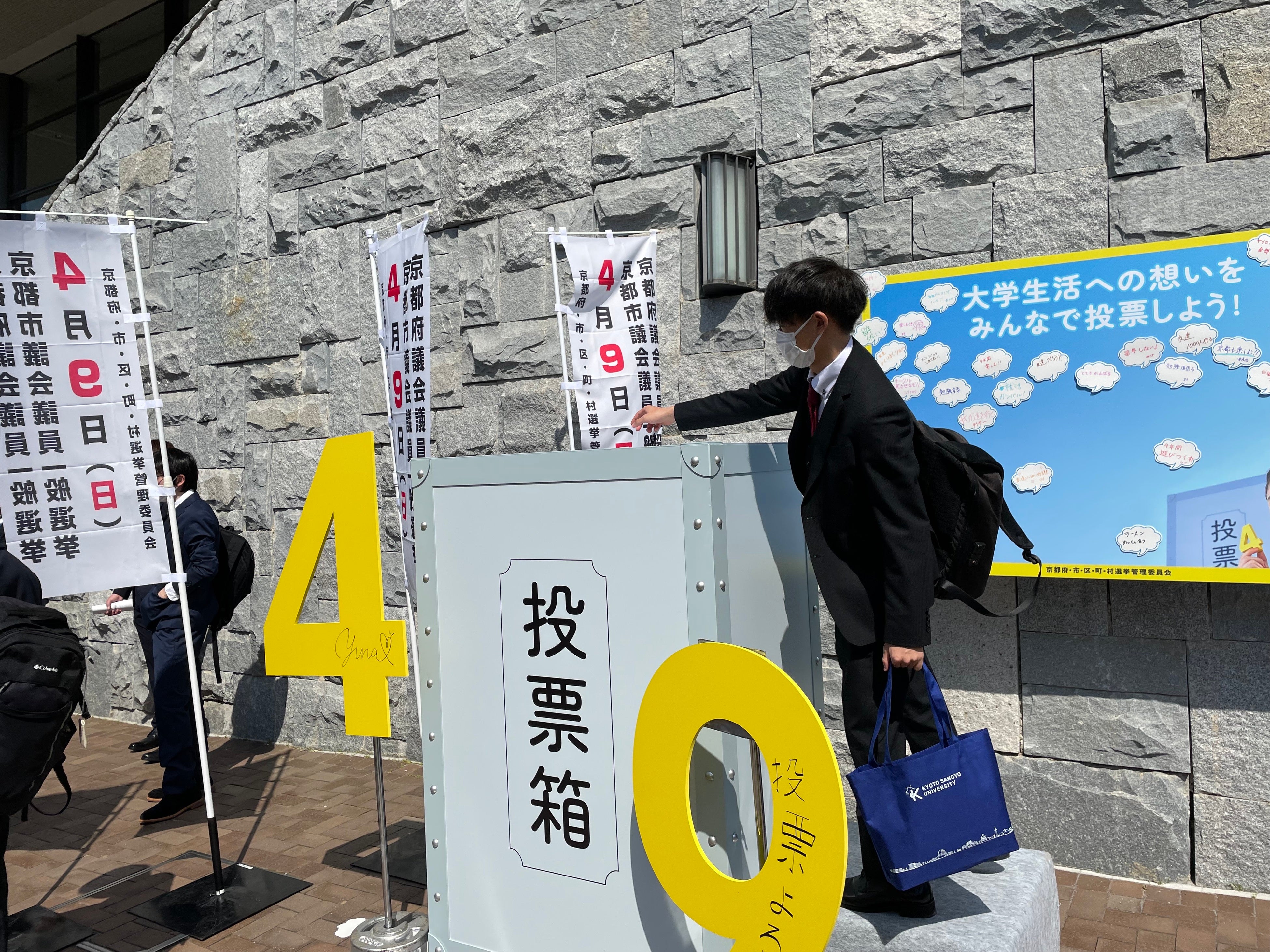 また、京都産業大学で行った調査の際には、京都府議選のCMやポスターなどにも使用されている巨大投票箱を、キャンパス内に設置。新入生に大学生活への想いを「投票カード」に記入してもらい、実際に巨大投票箱の中に投票する、という企画を実施しました。政治や選挙を身近に感じられる体験イベントを通して、新入生の方々に4月9日(日)の京都府議選への投票を促し、若年層の投票率向上を目指します。