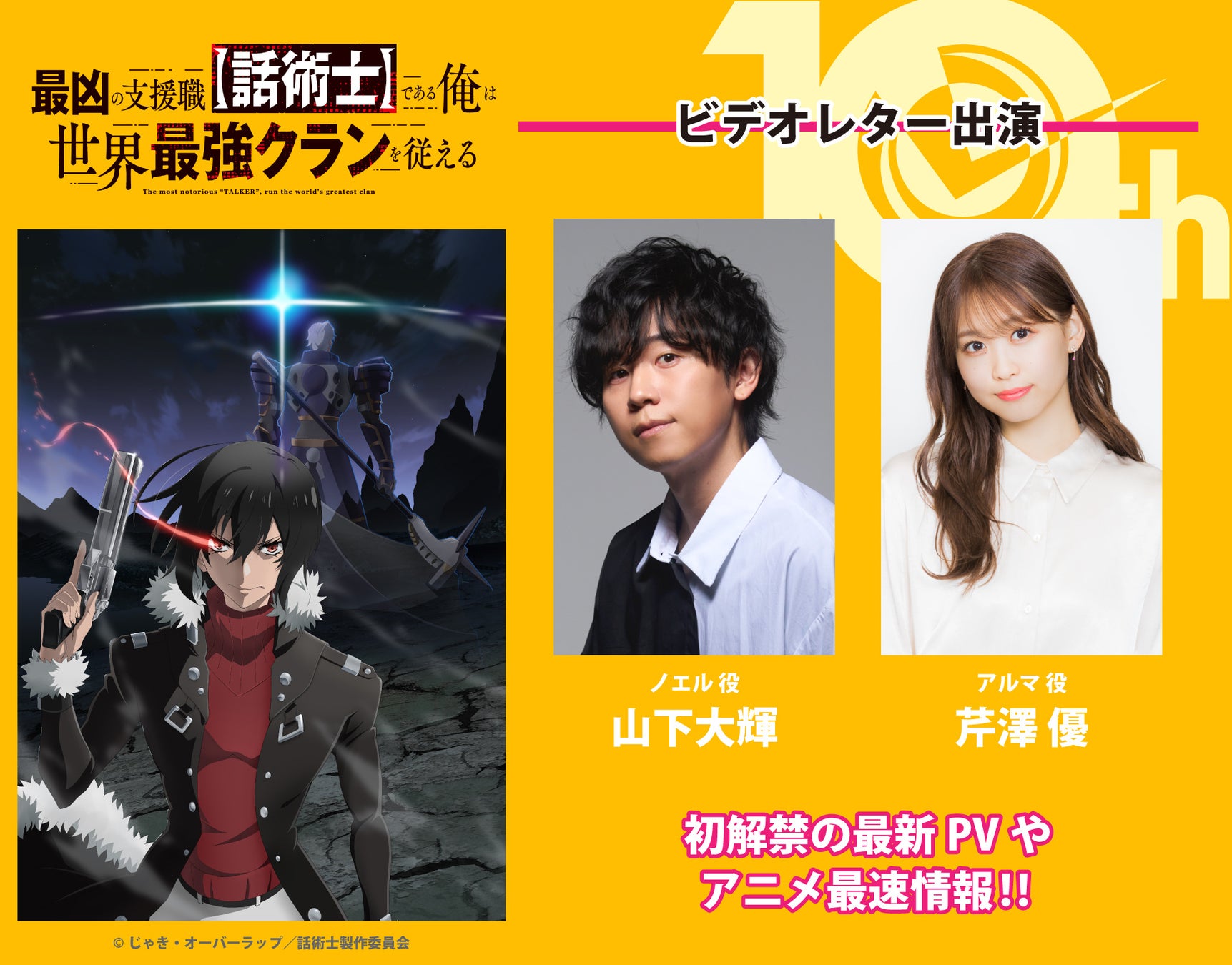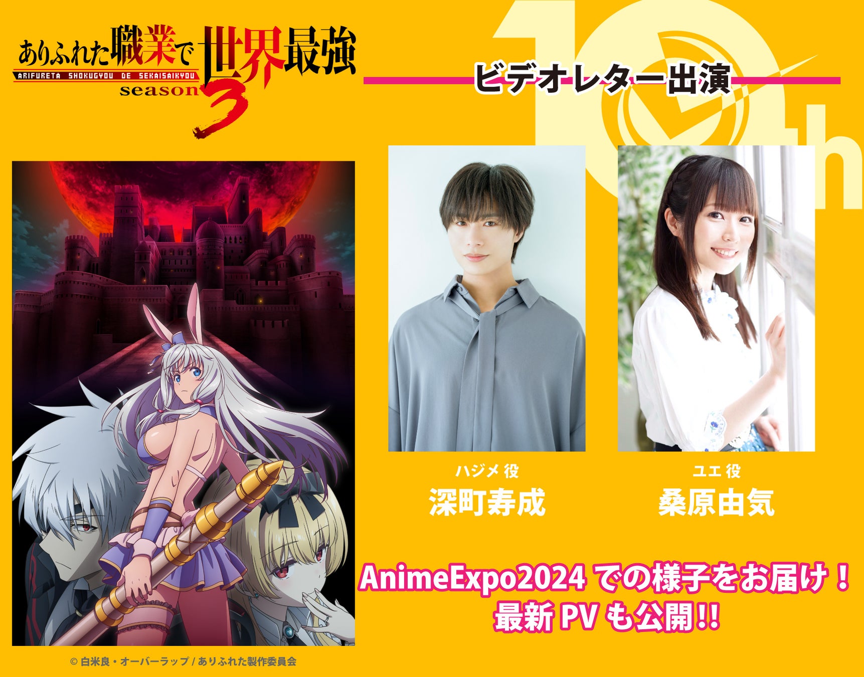 また、番組の中では10月から放送予定のTVアニメ「最凶の支援職【話術士】である俺は世界最強クランを従える」の最新情報を発表!ノエル役・山下大輝とアルマ役・芹澤優からのビデオレターや初解禁PVも公開予定だ。同じく10月からTVアニメ放送予定の「ありふれた職業で世界最強 season 3」からは、先日ロサンゼルスで開催された全米最大規模のコンベンション「Anime Expo(アニメエキスポ) 2024」で開催された先行上映会&キャストトークショーの様子をお届け!参加したハジメ役・深町寿成、ユエ役・桑原由気の現地からのビデオレターを公開予定となっている。