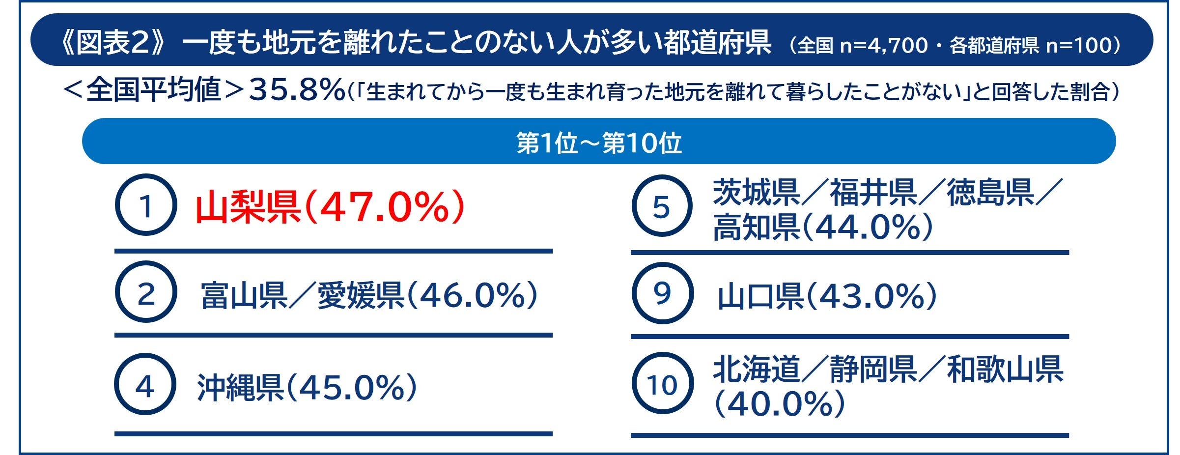 地元への居住経験についても調査を行いました。「生まれてから一度も生まれ育った地元を離れて暮らしたことがない」という“地元密着型”の人が最も多い都道府県は「山梨県」でした。「山梨県」は、全国平均(35.8%)を約11ポイント上回る47.0%を“地元密着型”が占め、約半数が一度も県外で暮らしたことがないことになります。そして、同率第2位は「富山県」「愛媛県」(46.0%)、第4位は「沖縄県」(45.0%)が続きました《図表2》。