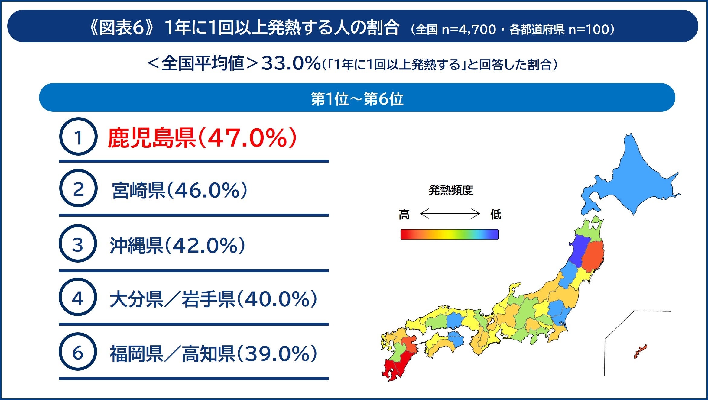 最後のトピックは体調不良時の“発熱”です。はじめに「発熱の頻度」について聞いた結果、1年に1回以上発熱する人の割合が最も多い都道府県は「鹿児島県」であることが明らかになりました。「鹿児島県」は、「1年に1回以上発熱する」と回答した割合が、全国平均(33.3%)よりも10ポイント以上多い47.0%に上りました《図表6》 。