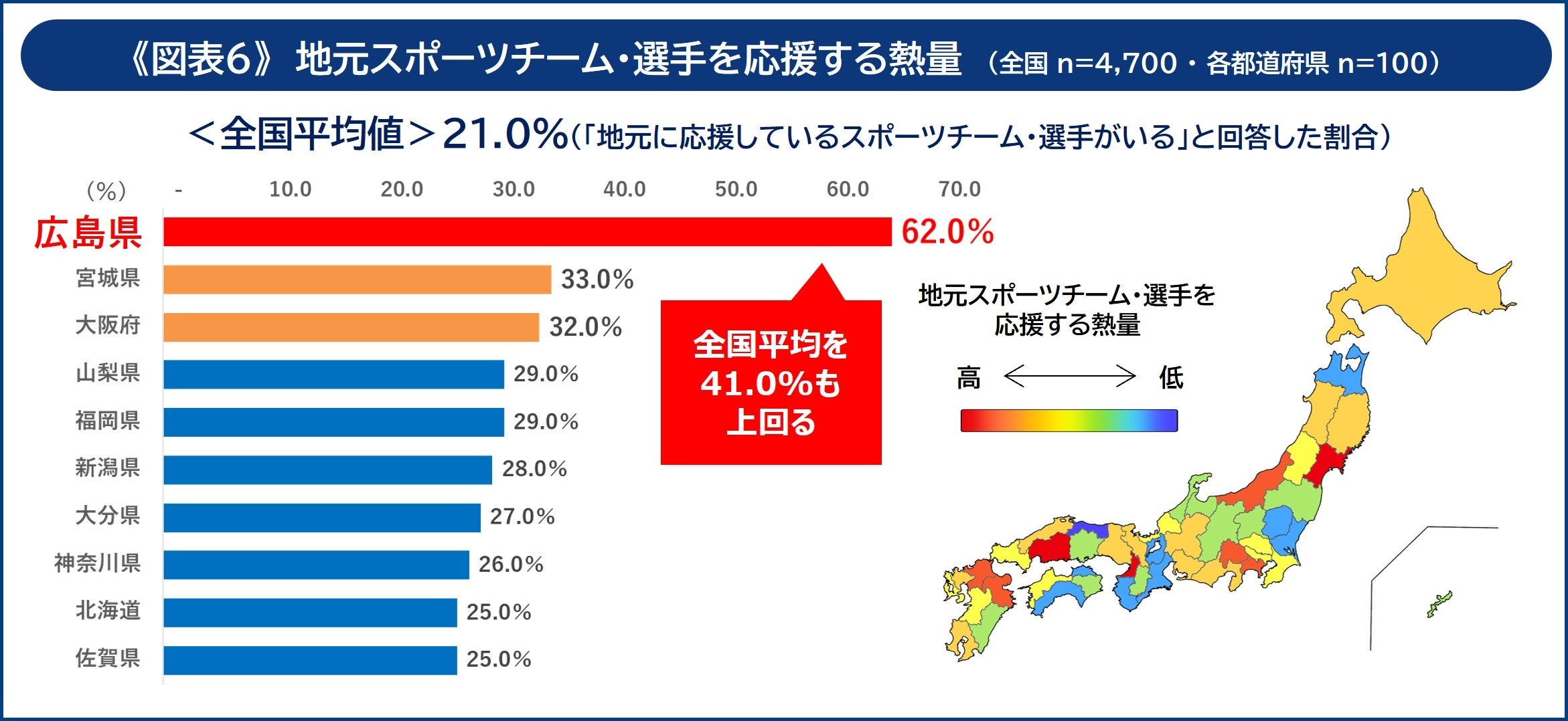 応援する地元のスポーツチームや選手の有無について聞いたところ、「広島県」は62.0%が「応援している地元チーム・選手がいる」と回答し、全国平均(21%)を大きく上回りました。また、続く「宮城県」(33.0%)に29ポイントの大差をつけています。「広島県」は、野球の「広島東洋カープ」、サッカーの「サンフレッチェ広島」など、サポーターの熱量が高いチームが多く、地元チームの盛り上がりが大きいことから、スポーツ観戦が好きな都道府県第2位、野球観戦率が高い都道府県第1位の結果につながったと考えられます《図6》。