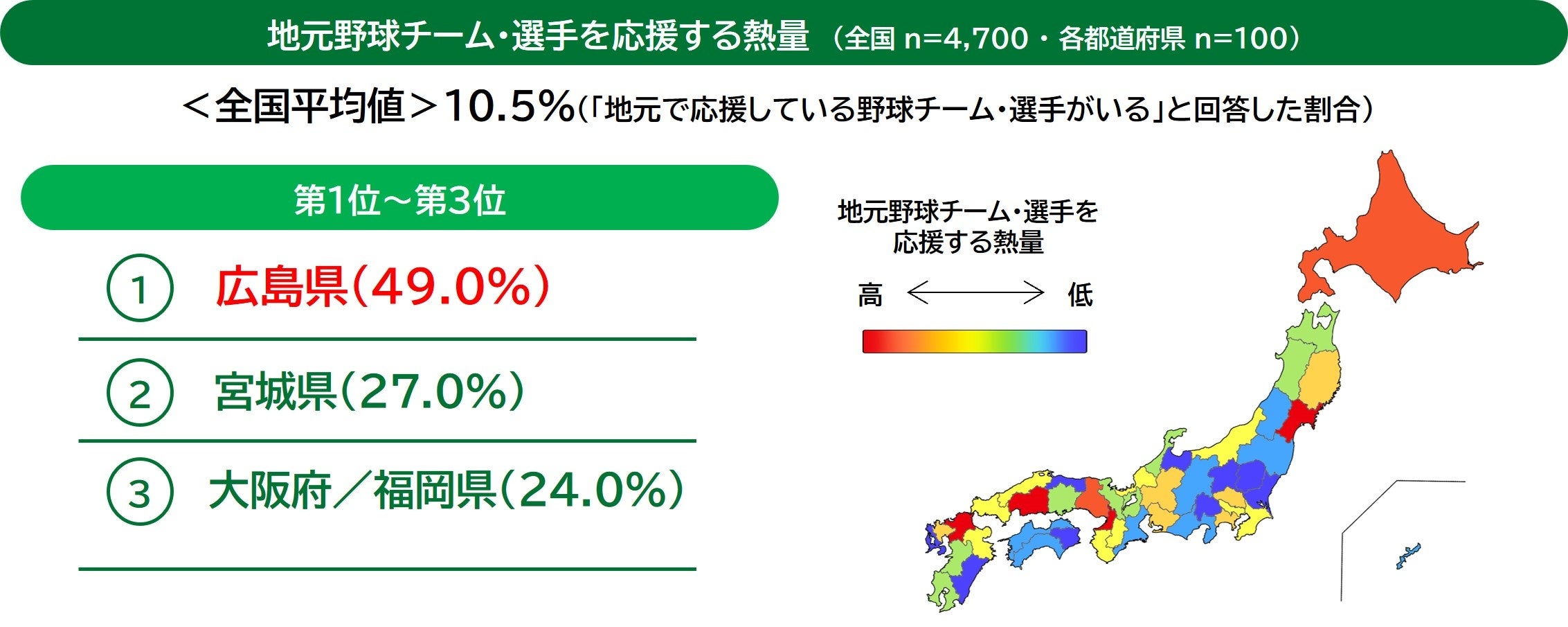 第1位「広島県(広島東洋カープ)」、第2位「宮城県(楽天イーグルス)」、第3位「大阪府(阪神タイガース)/福岡県(福岡ソフトバンクホークス)」という結果となりました。広島県では、約半数が「地元で応援している野球チーム・選手がいる」と回答しています。