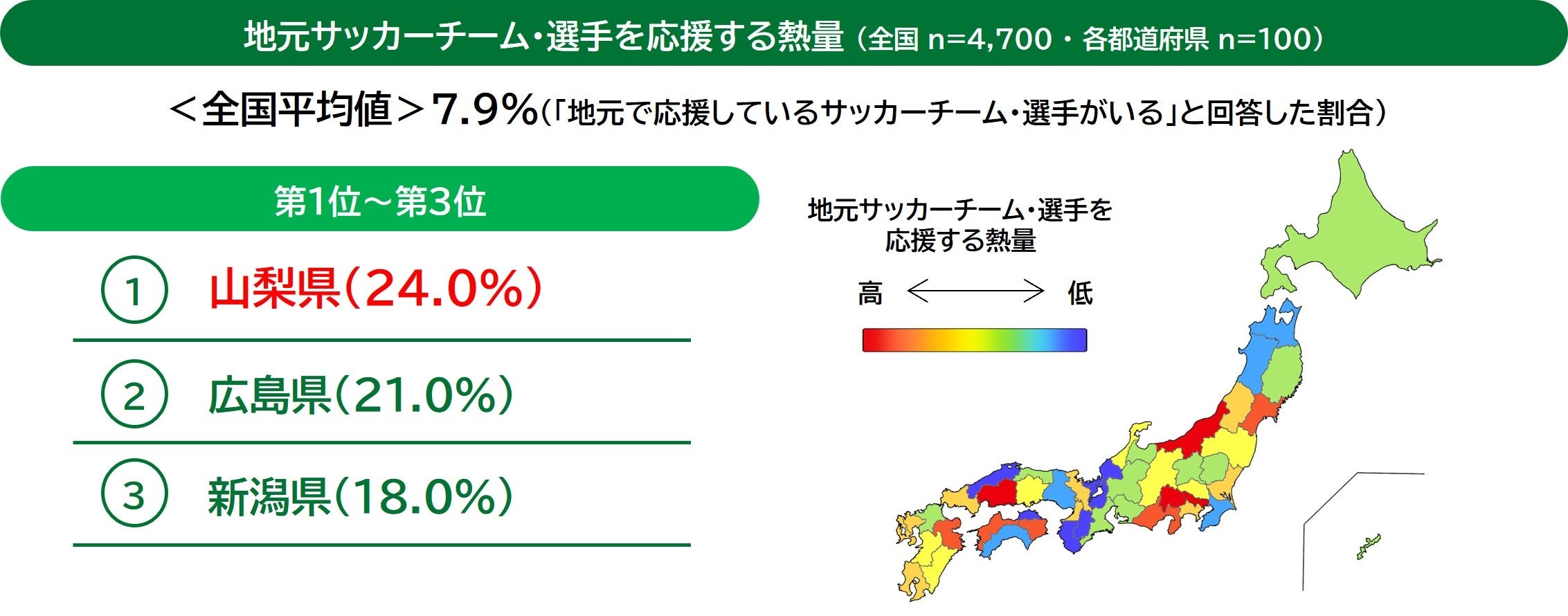 第1位「山梨県(ヴァンフォーレ甲府)」、第2位「広島県(サンフレッチェ広島)」、第3位「新潟県(アルビレックス新潟)」という結果となりました。第1位「山梨県」の地元チーム「ヴァンフォーレ甲府」は、全国で最も地元で応援されているチームであることがうかがえます。
