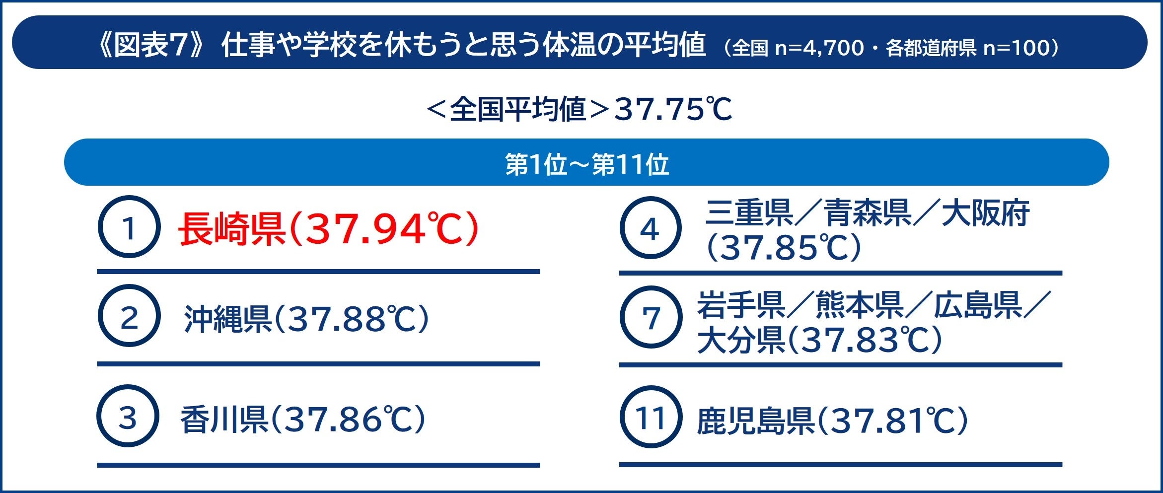 続いて、「仕事や学校を休もうと思う体温」について聞いたところ、最も体温が高い都道府県は「長崎県」でした。 全国平均値の37.75℃に対して、 「長崎県」は37.94℃ となり、38℃近くになるまで休まない傾向にあることが分かりました《図7》。