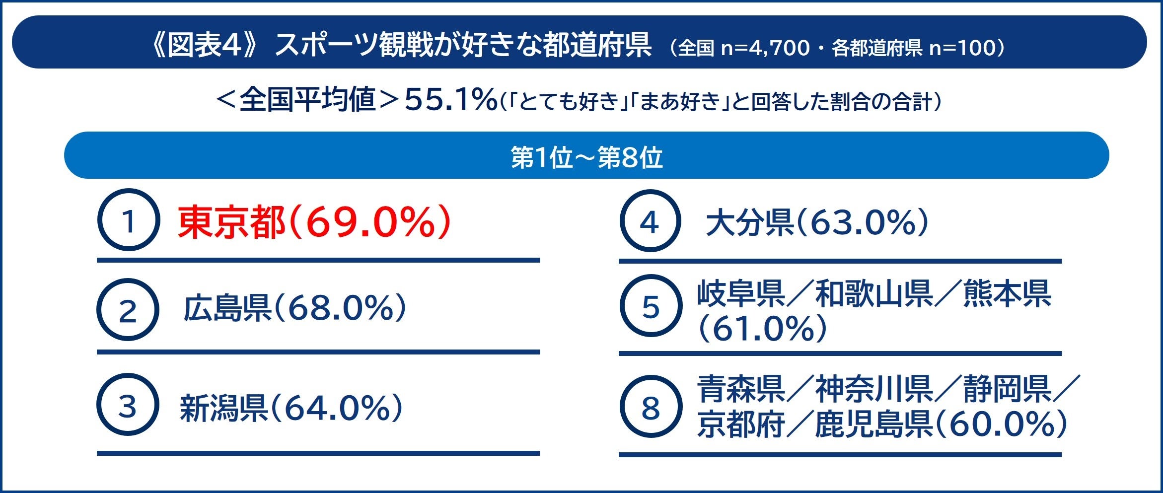 続いて“スポーツ熱”について調査を行いました。スポーツ観戦に対する熱量では、「東京都」が最も高く、全国平均(55.1%)を約14ポイント上回る69.0%が「スポーツ観戦が好き(とても好き+まあ好き)」と回答しました。僅差で「広島県」(68.0%)、そして「新潟県」(64.0%)が続きました《図表4》。