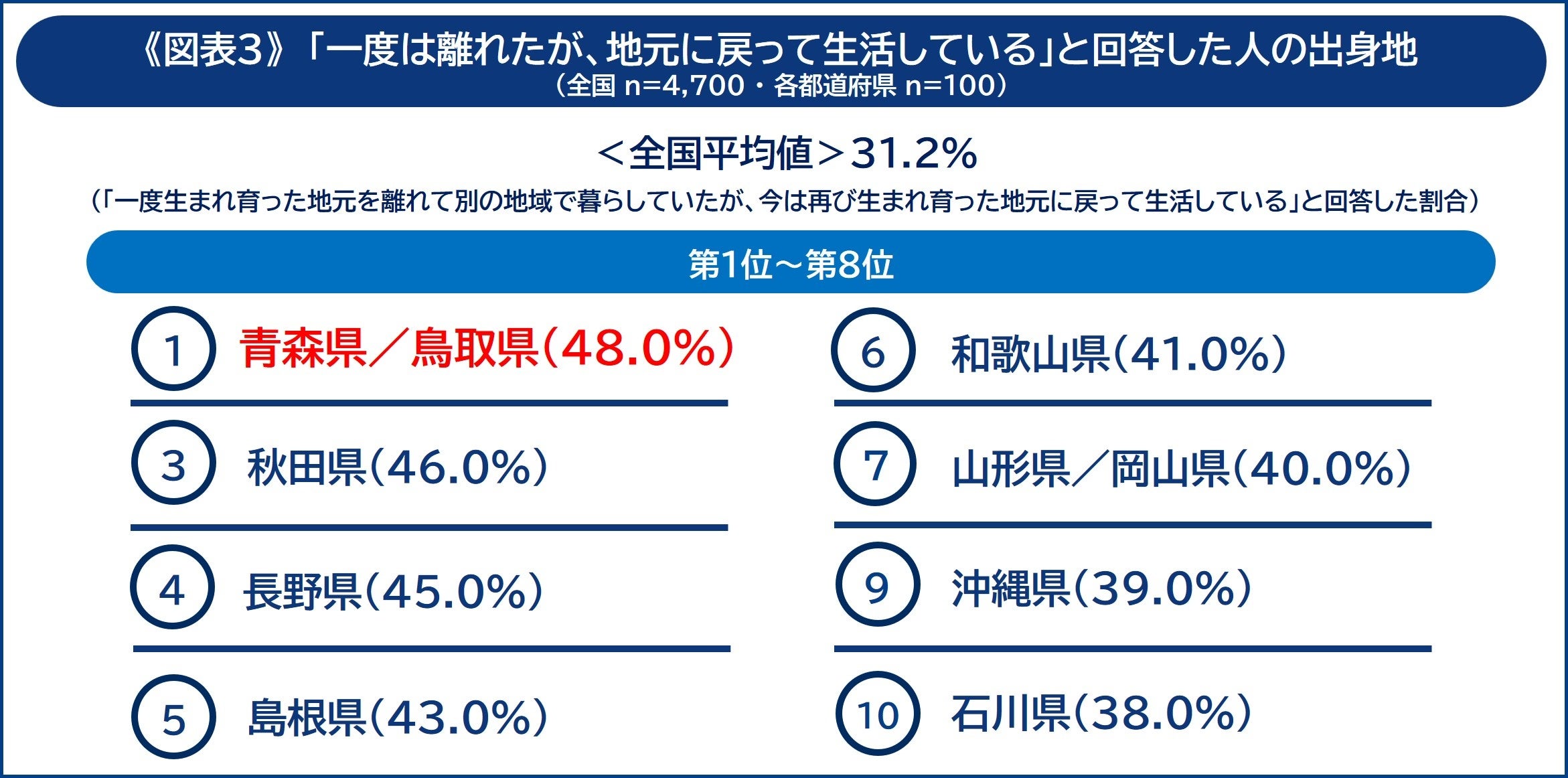 「一度生まれ育った地元を離れて別の地域で暮らしていたが、今は再び地元に戻って生活している」と回答した“地元回帰型”の人の出身地で最も多いのは、「青森県」と「鳥取県」でした。両県は48%と、全国平均(31.2%)を15ポイントも上回りました。次いで、「秋田県」(46.0%)、「長野県」(45.0%)が多い結果となりました《図表3》。