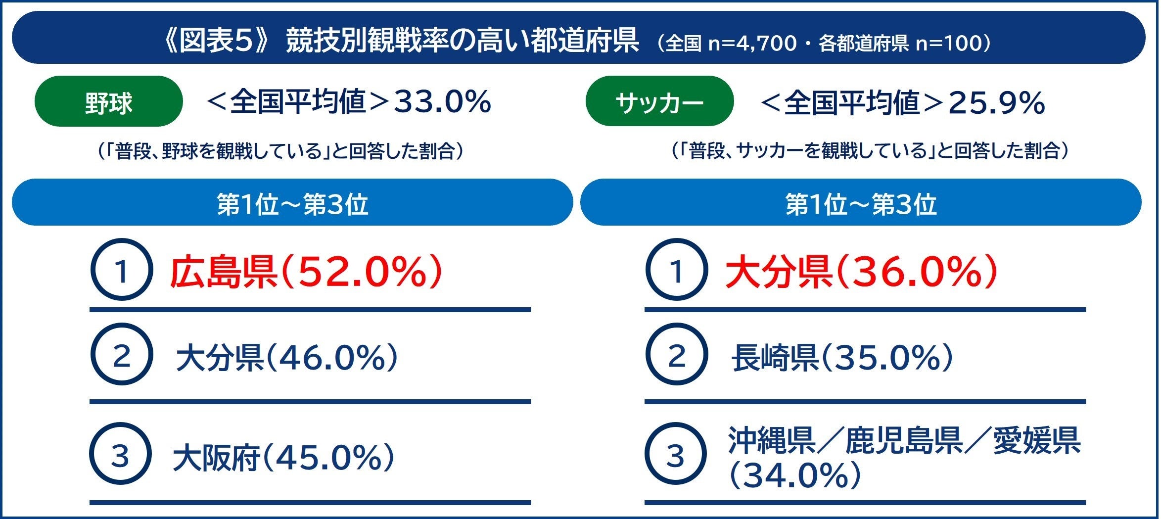 さらに、都道府県ごとの各スポーツの観戦率について調査したところ、「野球」の観戦率が高い都道府県第1位は「広島県」(52.0%)でした。全国平均(33.0%)を大きく上回り、回答者の約2人に1人は野球観戦をしていることになります。また、「サッカー」は「大分県」(36.0%)が最も高い結果となりました《図5》。
