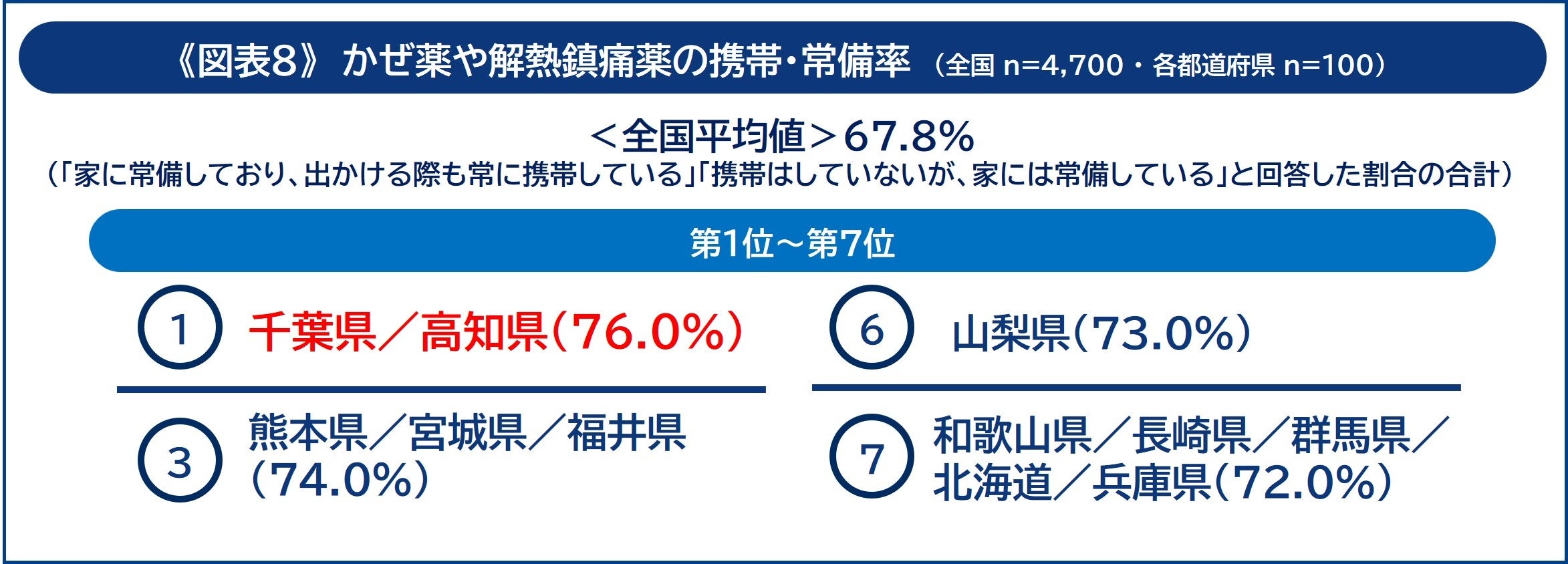 次に、体調不良に備えた「薬の常備」について聞きました。その結果、かぜ薬や解熱鎮痛薬を常備しているまたは携帯していると回答した人が最も多い都道府県は、同率で「千葉県」と「高知県」でした。「千葉県」と「高知県」は76.0%と、全国平均(67.8%)より約8ポイント高く、備えをしっかりしていることがうかがえます《図表8》。