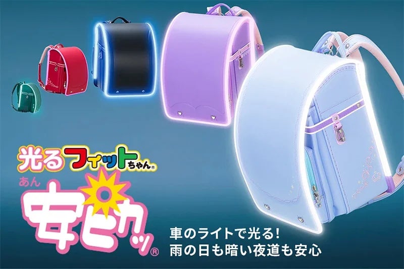 フィットちゃんランドセルには、200種類80色以上の豊富なラインナップに加え、肩ベルトがぷにぷにの「楽ッション」や、車のライトなどにピカッと反応する「安ピカッ」などの機能が盛りだくさん。