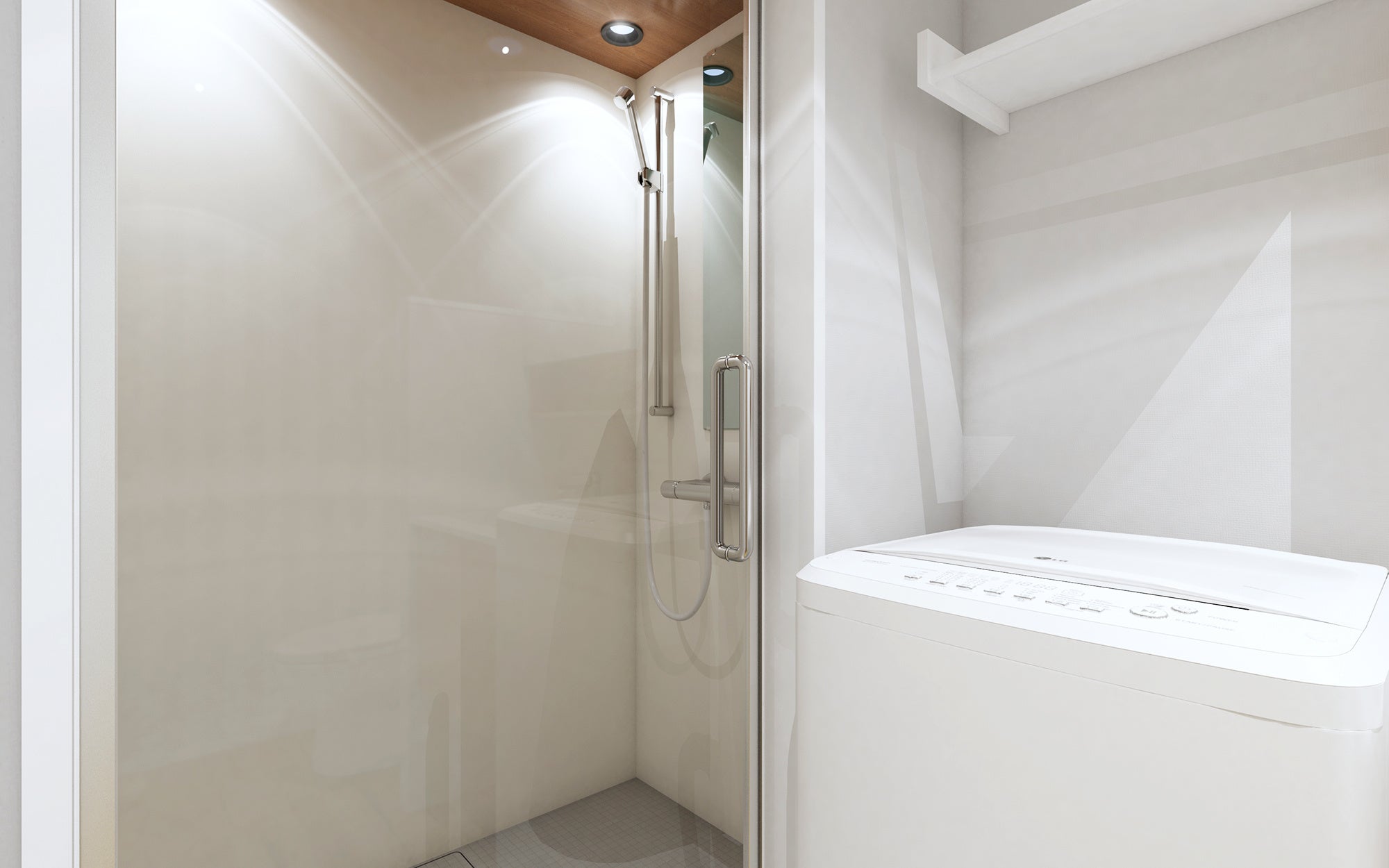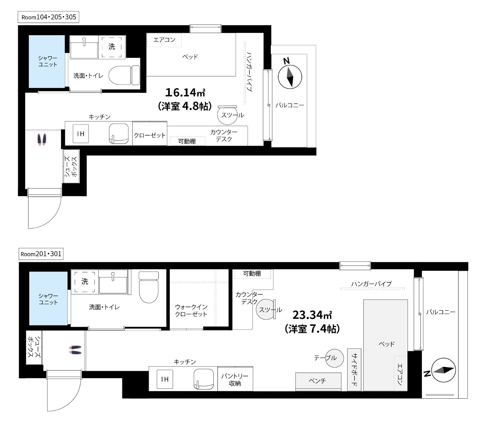 オリジナルキッチン・カトラリー・クローゼット、2口IHコンロ シャワーユニット、造作カウンター、ハンガーパイプウォークインクローゼット(201号室・301号室) 、家具・家電付き、ベッド(マットレスなし)、冷蔵庫、洗濯機 ソファー・サイドテーブル・シェルフ(201号室・301号室) インターネット無料、オートロック付き、TVモニターホン、バルコニー 防犯カメラ、独立洗面台、温水洗浄便座、エアコン