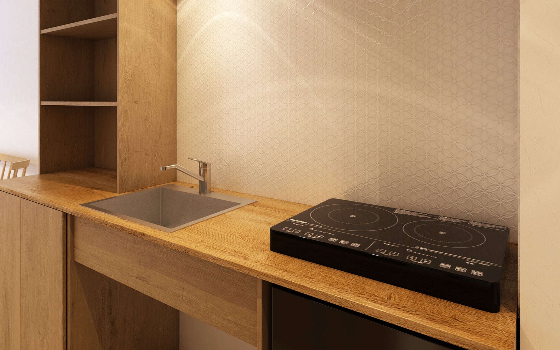 賃料を抑えるため、本物件は16.14平米とコンパクトなお部屋からご用意していますが、当社ではコンパクトでも豊かなひとり暮らし空間の設計実績があります。本物件もカウンターデスクやスツール、収納など、レイアウトを弊社が事前にコーディネートした物件となっています。