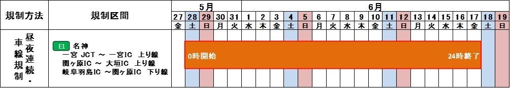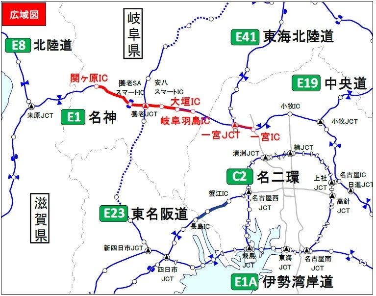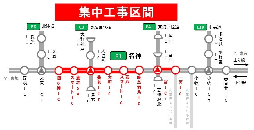 NEXCO中日本 名古屋支社(名古屋市中区、支社長・池田 光次(いけだ こうじ))は、安全を何よりも優先し、安心で快適に高速道路をご利用いただくため、5月28日(土)0時から6月17日(金)24時までの間、E1名神高速道路(名神)一宮インターチェンジ(IC)~関ヶ原ICで集中工事(昼夜連続・車線規制)を実施いたします。