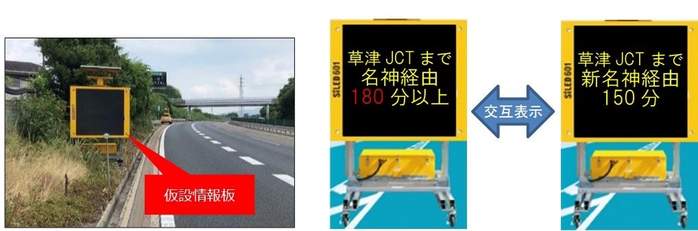工事期間中は、工事区間を含む主な目的地への所要時間情報を提供するため、IC入口やJCT手前に仮設情報板を設置します。走行ルートを検討される際にご活用ください。