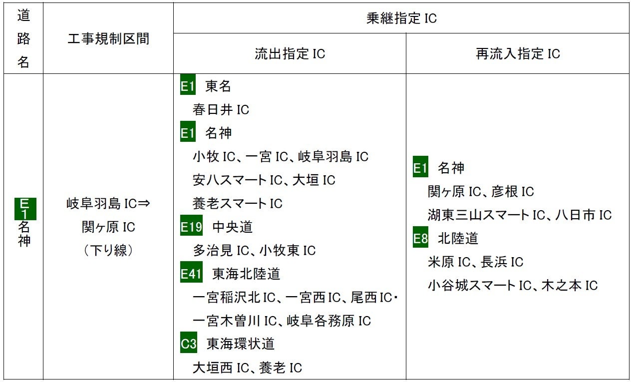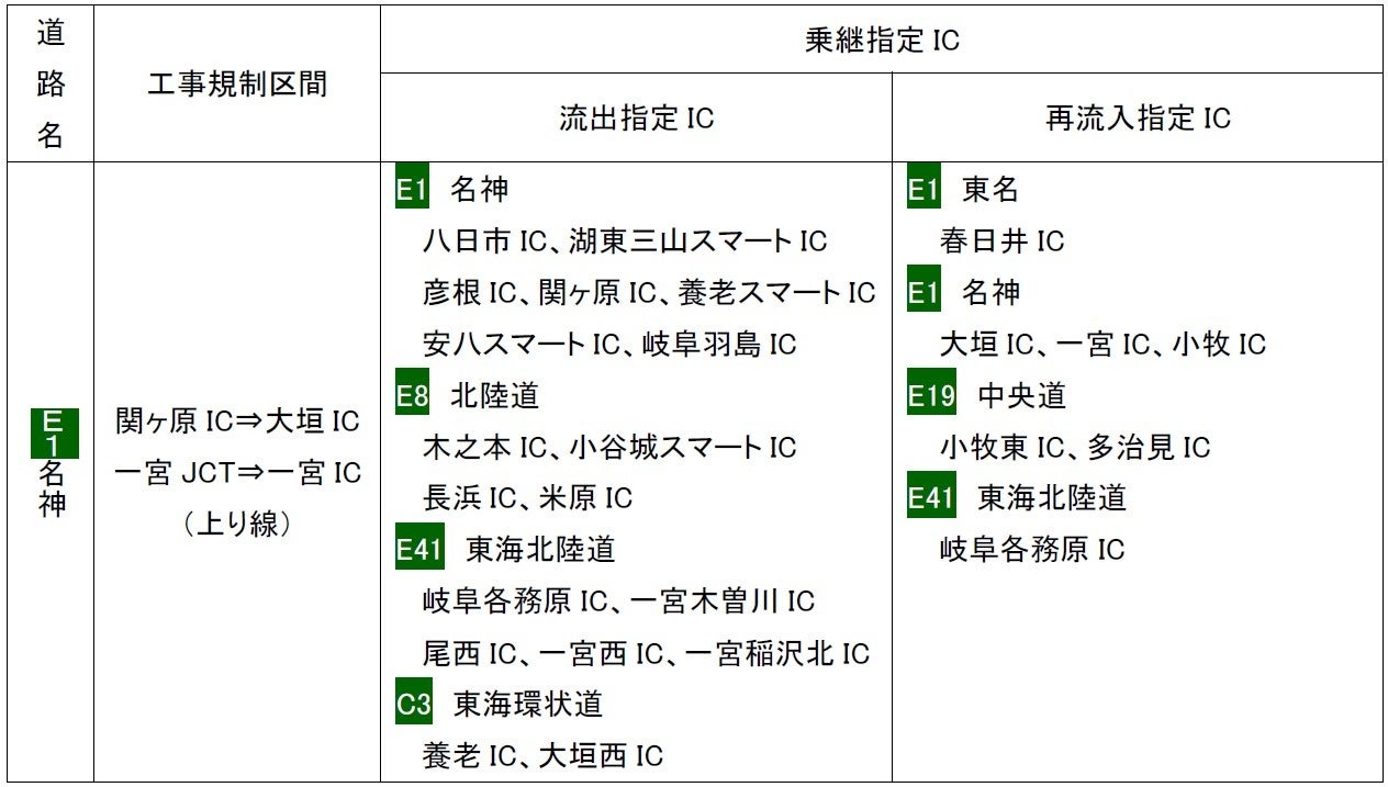 【関ヶ原IC~大垣IC、一宮JCT~一宮IC 上り線の車線規制時における乗継指定IC】