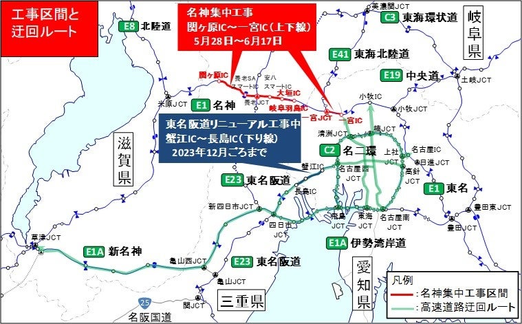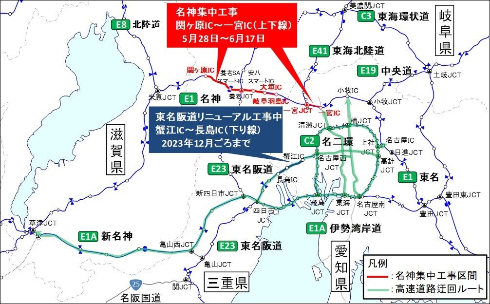 5月28日(土)0時から6月17日(金)24時まで~E1A 伊勢湾岸道・新名神、C2 名二環、名古屋高速などへの迂回をお願いいたします~