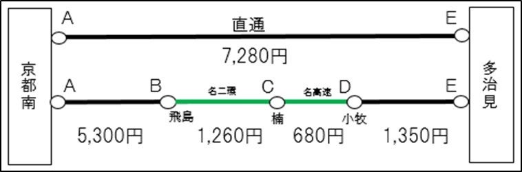 ※料金調整における時間帯割引の適用については、直通走行した場合に適用されるETC時間帯割引を適用したうえで料金調整をおこないます。