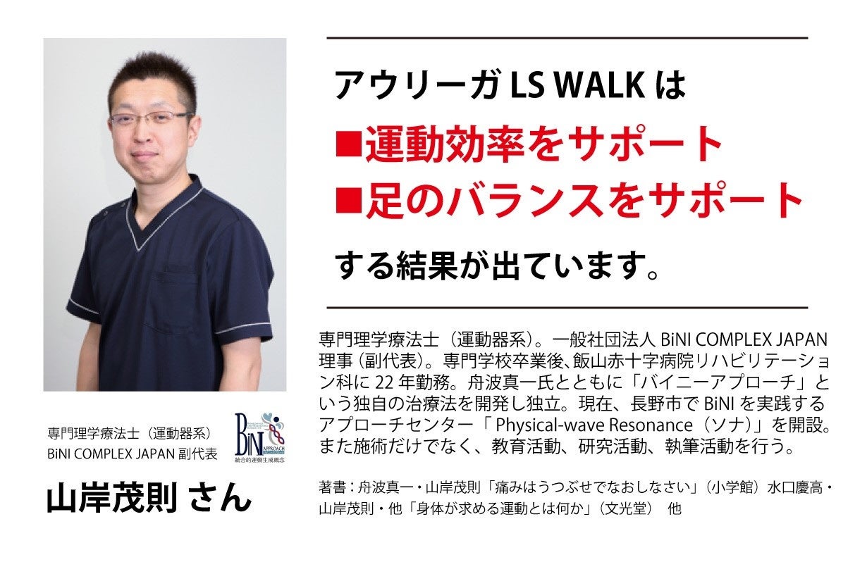 日常に寄り添う靴として足の健康にも役立ちたいという思いから、新型AULIGAは足と身体の専門家「山岸茂則」氏に監修していただきました。屈曲性や補強材(カウンター)の調整に意見を頂き、内部構造をアップデート。ウォーキングシューズとしても非常に高いレベルの測定結果をもたらしました。