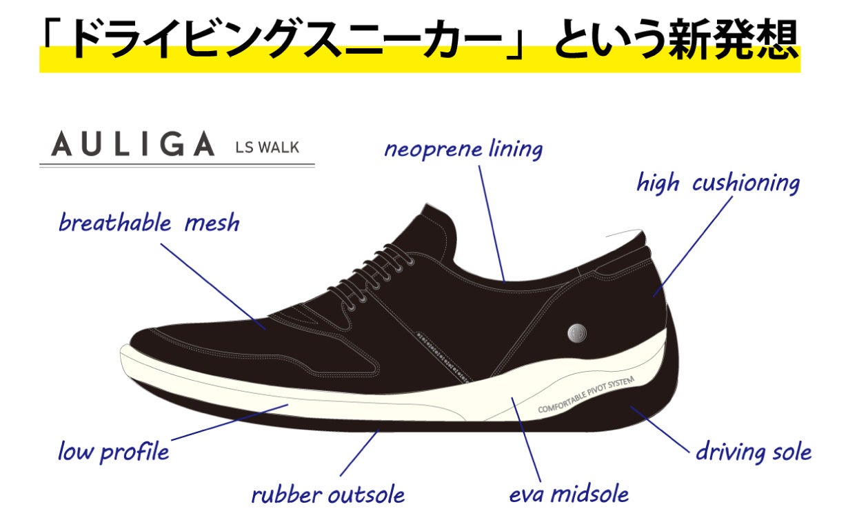 運転も歩きも快適に。次世代ドライビングシューズ「AULIGA」から理学療法士公認の新型スニーカーが登場!