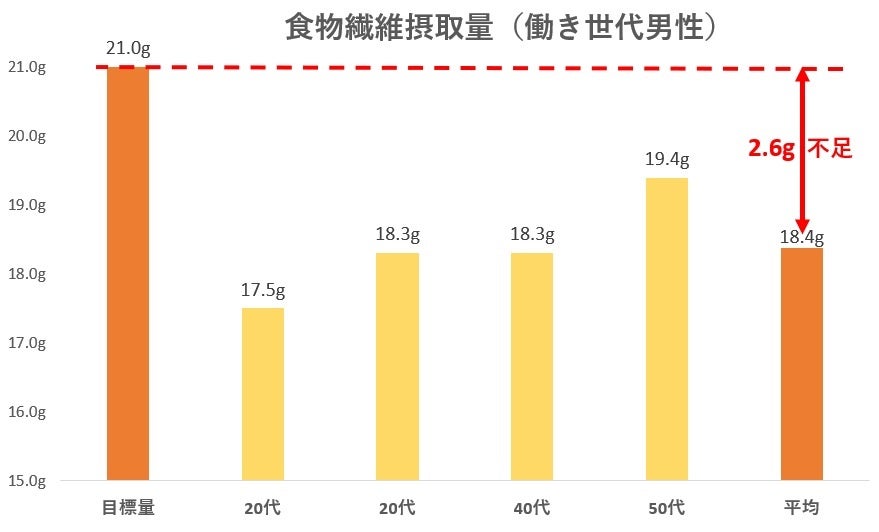 食物繊維は、腸内環境の改善、食後血糖値上昇抑制効果、コレステロール等の脂質を排出する効果、抗糖化作用などがあることが知られています。また、近年、糖尿病薬としても注目され、腸内で分泌されるGLP-1の分泌を高めたり、腸内で発酵したりすることで腸内細菌により産生された短鎖脂肪酸の働きで、食欲抑制、免疫、血糖上昇抑制、腸内のバリア機能とも関係するムチン分泌の促進、アレルギー対策など、様々な効果が注目されている栄養素です。一方、前出の「令和元年 国民健康・栄養調査」でも、20~50代男女ともに不足しており、特に忙しい毎日を送る働き世代の問題となっています。