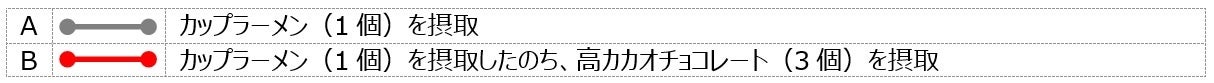 ※市販のカップラーメン、高カカオチョコレート(86%)を使用。カップラーメン摂取15分後に、高カカオチョコレート(3個)を摂取。SOUKEN社に依頼し、倫理委員会申請・承認後、試験を実施しました。