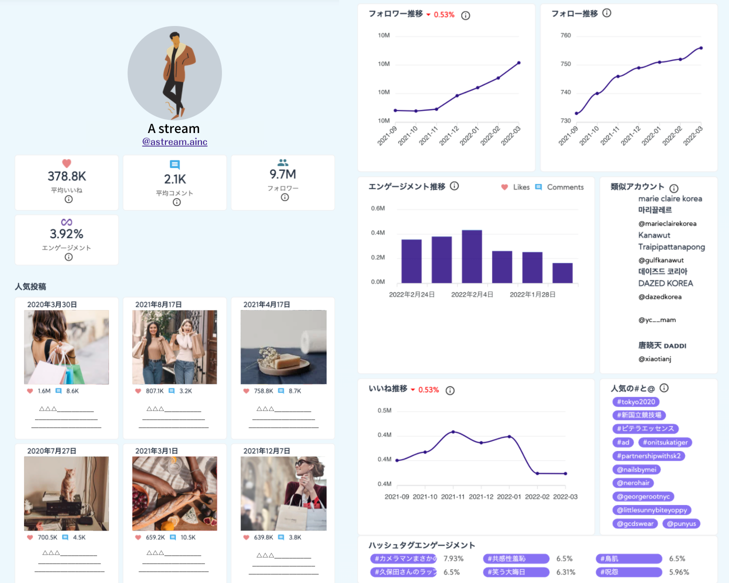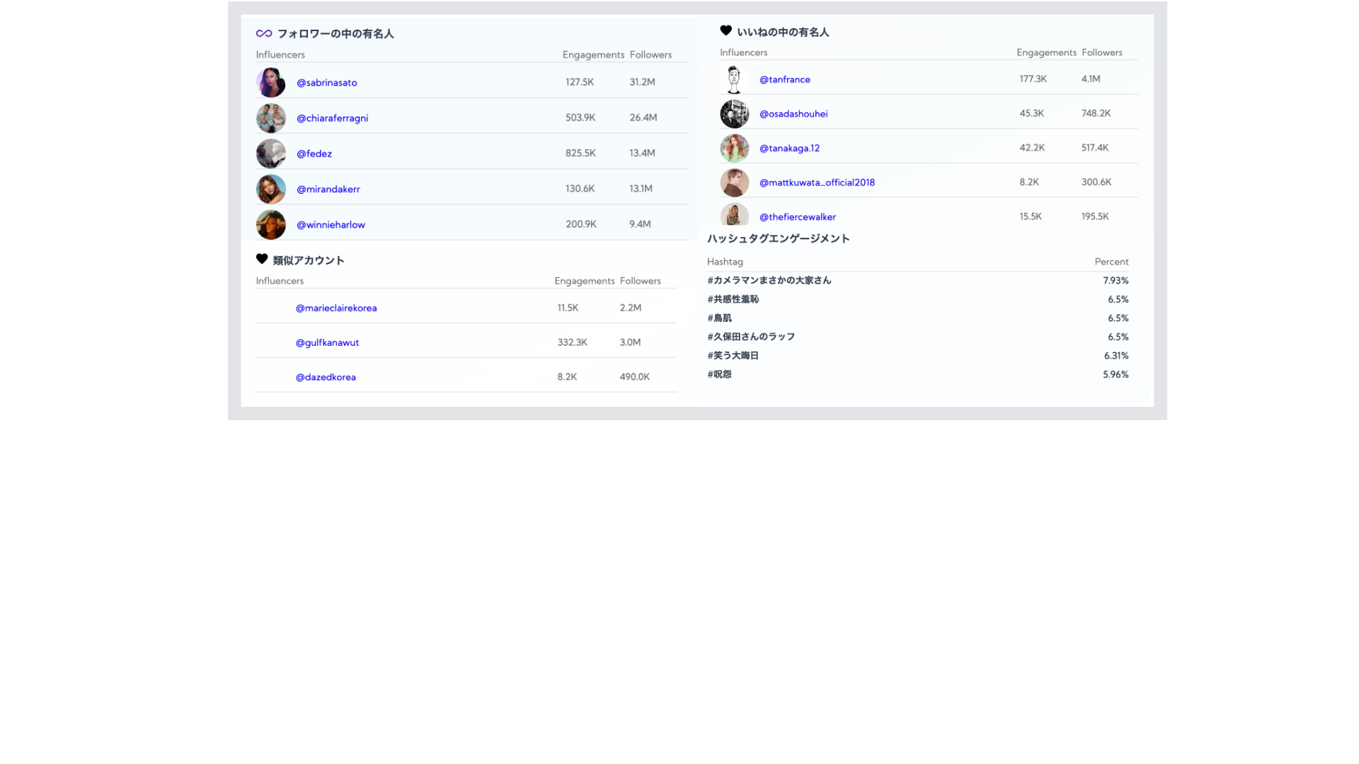 ハッシュタグエンゲージメントとは、どのハッシュタグをつけた投稿がエンゲージメント率が高いか算出しています。ハッシュタグエンゲージメントからインフルエンサーに適した商材のジャンルを推測することが可能です。