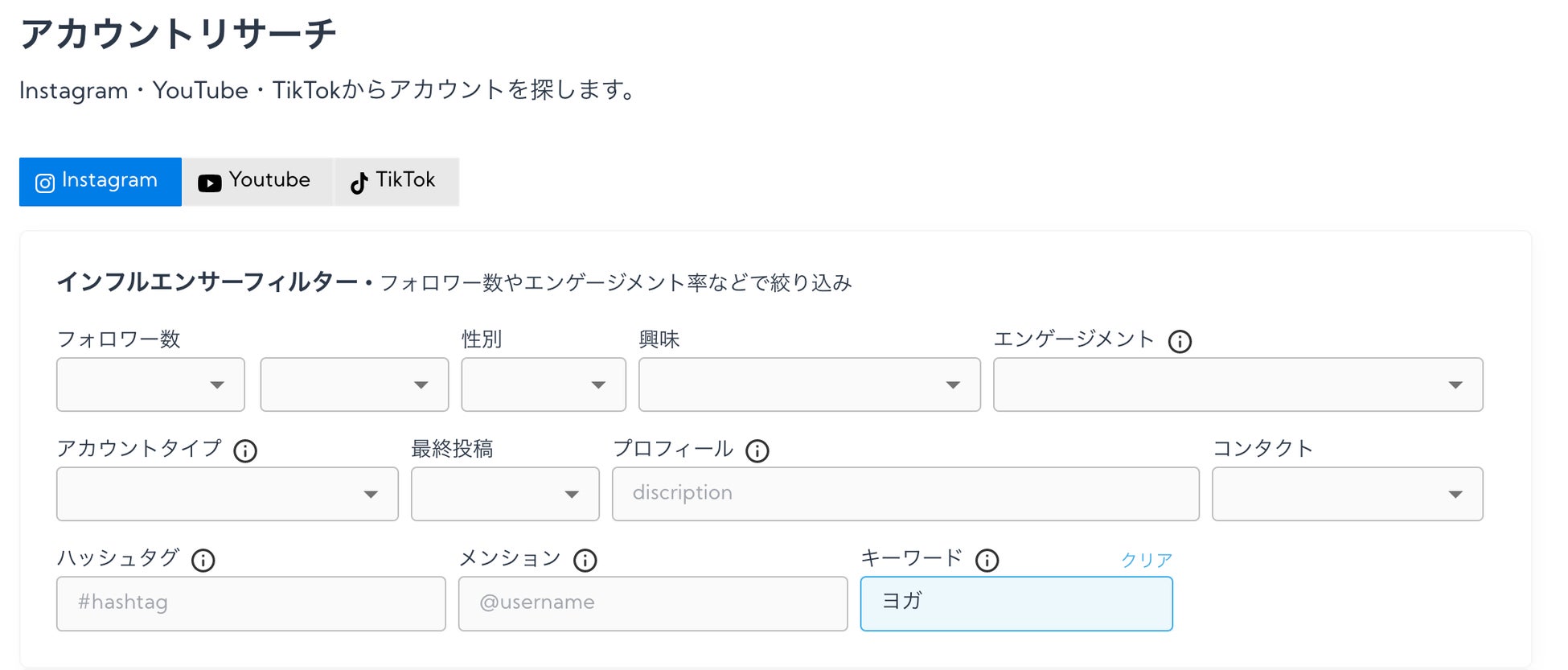 例えば、ヨガウェアのPR施策でヨガに関心のあるインフルエンサーを発掘したい場合、「アカウントリサーチ」機能の”キーワード”に「ヨガ」と入力。すると、ヨガ関連の投稿をしているインフルエンサーが表示されます。