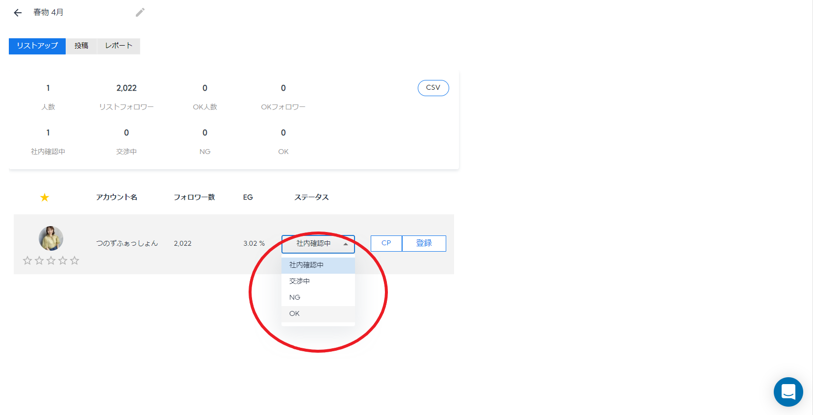 上図のように、インフルエンサ―の進行状況をステータスで簡単に管理。ヒューマンエラーを防ぎ、業務の効率化を図ります。