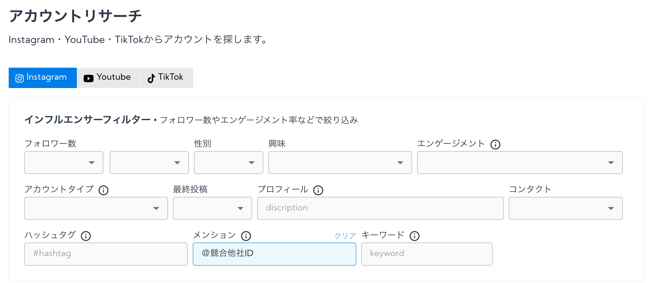 メンション検索を用いて、「アカウントリサーチ」機能の”メンション”に「@競合ブランドのID」を入力。すると、競合他社のPR投稿をしているインフルエンサーも容易に検索が可能です。