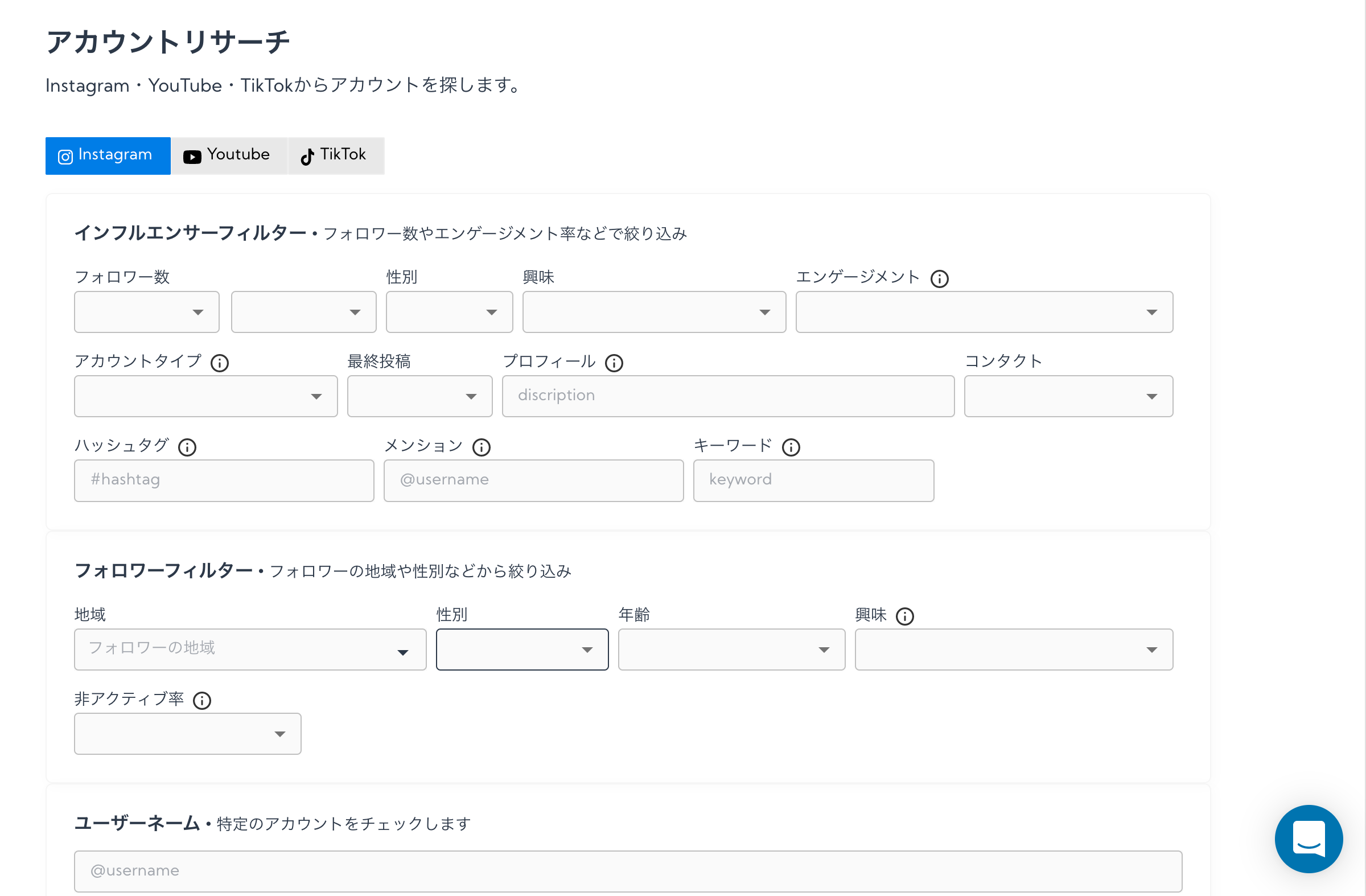 A streamに搭載している「アカウントリサーチ機能」では必要なインフルエンサーのセグメントをフィルターを使って瞬時に検索することができます。
