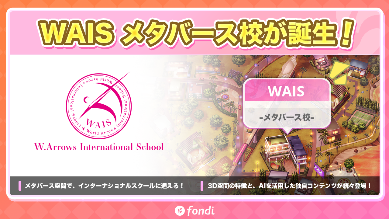 この度、オンラインで日本の学校に通いながらアメリカの高校の卒業証明書取得を目指せるWAISのメタバース校が、fondi上に新設されます。WAIS fondi校(メタバース校)では、WAISの生徒様がメタバース上でのレッスン・学習コンテンツ、生徒様同士のコミュニケーションを楽しめる独自空間を共同で提供します。