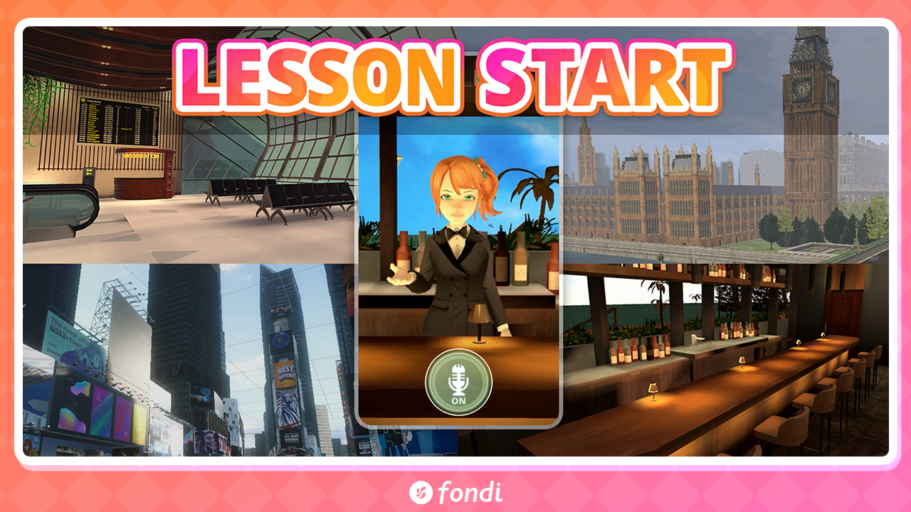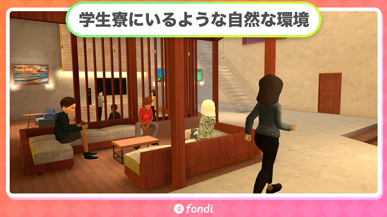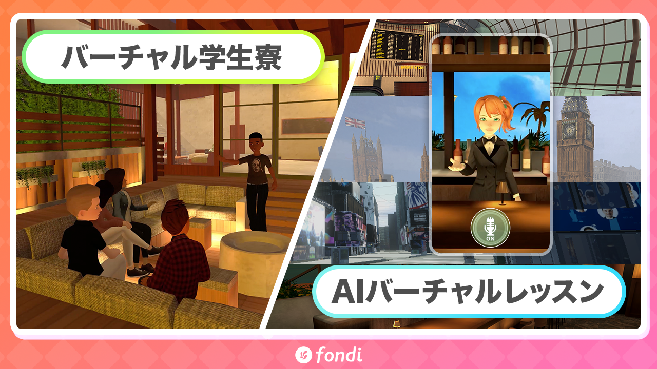 fondiは、スマホアプリで簡単にバーチャル留学のような体験を楽しめる英会話メタバースです。世界100カ国以上から集まる英会話学習者と、バーチャル空間でのコミュニケーションを通じてより実践的な英会話の機会を提供しています。