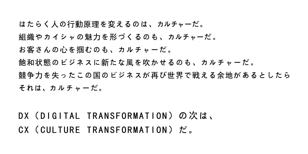 ビジョン経営、パーパス経営からカルチャー経営へ。DX(デジタル・トランスフォーメーション)からCX(カルチャー・トランスフォーメーション)という発想で社内にカルチャーをインストール。