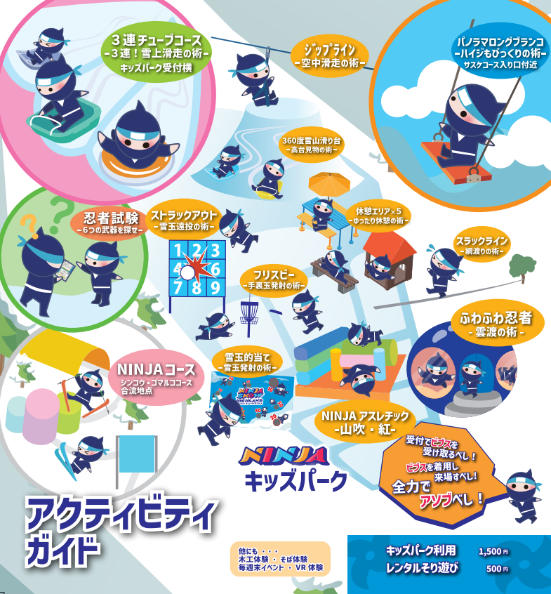 「3連チューブコース(3連!雪上滑走の術)/ふわふわ忍者(ふわふわ忍者-雲渡の術-)/NINJAアスレチック(山吹・紅 )/パノラマロングブランコ(ハイジもびっくりの術)/ジップライン(空中滑走の術)雪玉的当て(雪玉発射の術)/ストラックアウト(雪玉遠投の術)/フリスビー(手裏玉発射の術)/360度雪山滑り台(高台見物の術)/スラックライン(綱渡りの術)/休憩エリア×5(ゆったり休憩の術)/キッズブランコ(ゆらゆら浮遊の術)
