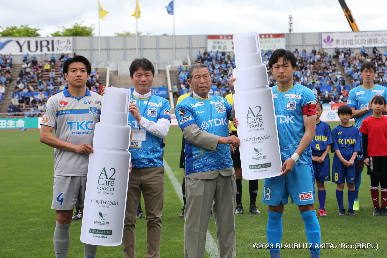 試合開始前のセレモニーにて、ブラウブリッツ秋田の才藤龍治選手、栃木SCの佐藤祥選手へ、元キョーリンリメディオ株式会社専務取締役 阿部勉様とエーツーケア株式会社監査役 鈴木孝宏から「A2Careマウスウォッシュ」の贈呈式が行われました。