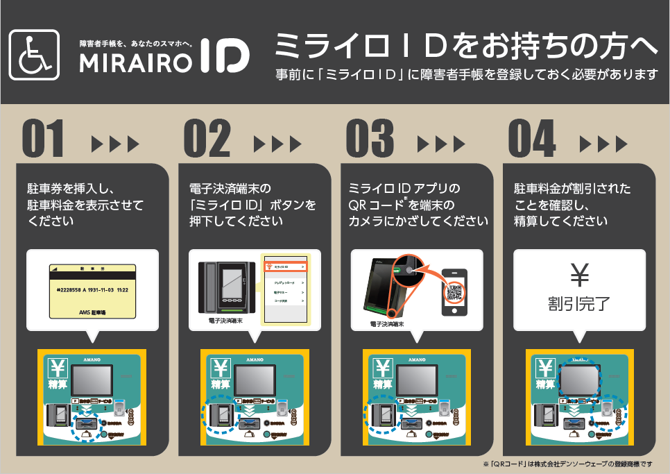 ミライロIDにてQRコードを表示させ、駐車場精算機にかざすことで、駐車料金の減免が適用されます。