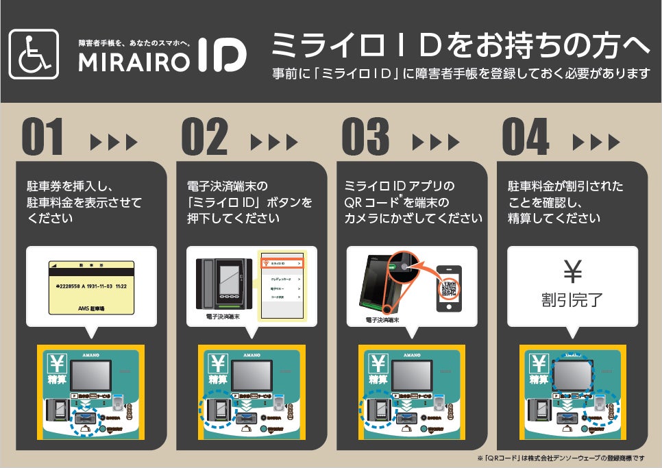 ゲート式駐車場においてデジタル障害者手帳「ミライロID」のQRコード機能を活用して減免手続きができるようになります。