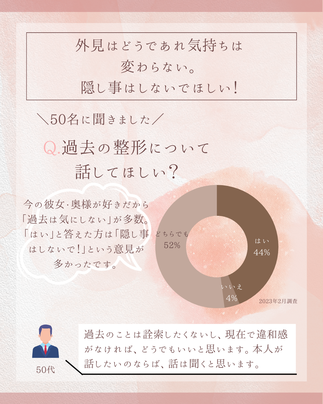 次に多い回答は、過去の整形については話してほしいの「はい(44%)」でした。