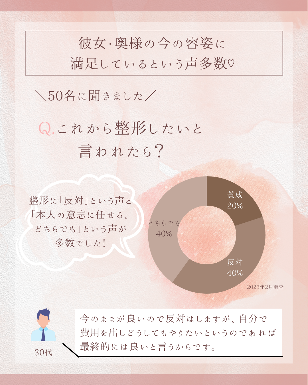 他には、整形による健康被害・メスを入れることへの心配などお相手を気遣うコメントも多く集まりました。