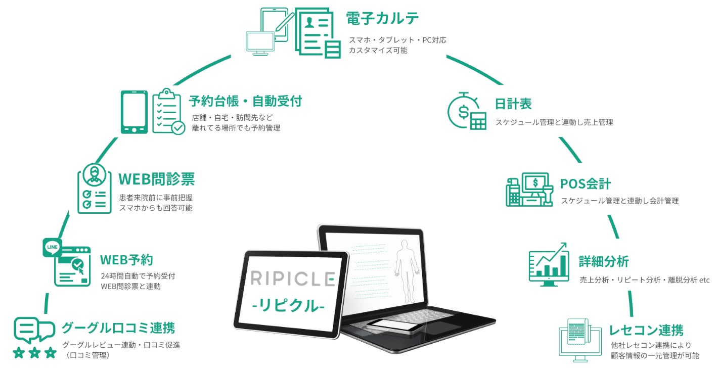 「リピクル」は、治療院や店舗向けに設計された総合的なプラットフォームであり、集客から問診、カルテ作成、決済、顧客関係管理(CRM)からレセコンまで、全てのプロセスを一元化しています。