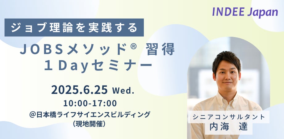 その一環として、2025年6月に『ジョブ理論を実践する「JOBSメソッド® 習得 1Dayセミナー」』を開催予定です。本セミナーでは、JOBSメソッドの基本に加え、2.0で拡充された各種ツールや手法の一部をご紹介します。演習も豊富に盛り込まれており、理解を深めながら実践力を高められる内容となっています。