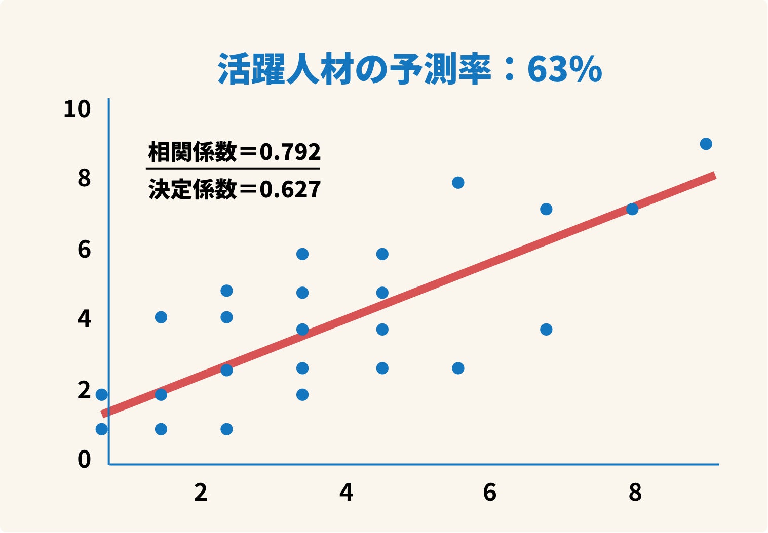 また、別の実証実験では、CIY®適性検査で数値化される「マッチスコア(企業文化、及び職務に必要な能力との適性を表すスコア)」と、既存社員のパフォーマンスの順位の相関を分析しました。