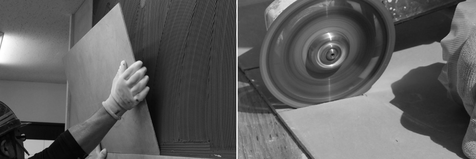 2.割り付けのしやすい大盤の2サイズで、10kg/㎡程度と軽量で現場での切断加工もタイルやブロックより容易で、施工性が良好。