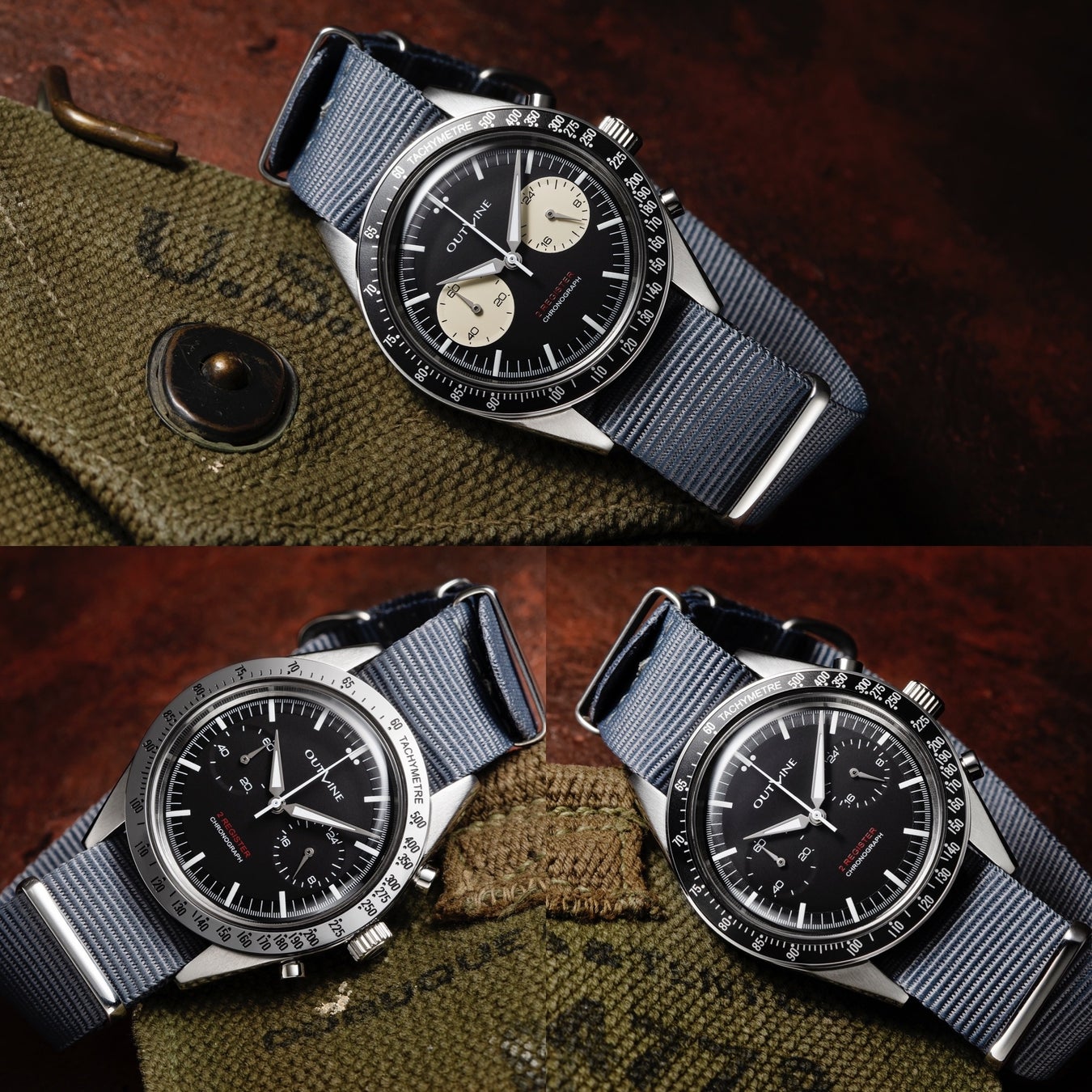 商品のラインナップは全3種類。黒ベゼルに二つのインダイアルを白にした通称逆パンダタイプ、同じく黒ベゼルに黒1色文字盤タイプ。そしてベゼルをメタルの鏡面仕上げにした黒文字盤タイプが1種類です。なお、黒ベゼル×黒文字盤タイプは時計のセレクトショップ「オンタイム・ムーヴ」とアウトライン公式サイト限定販売商品となります。