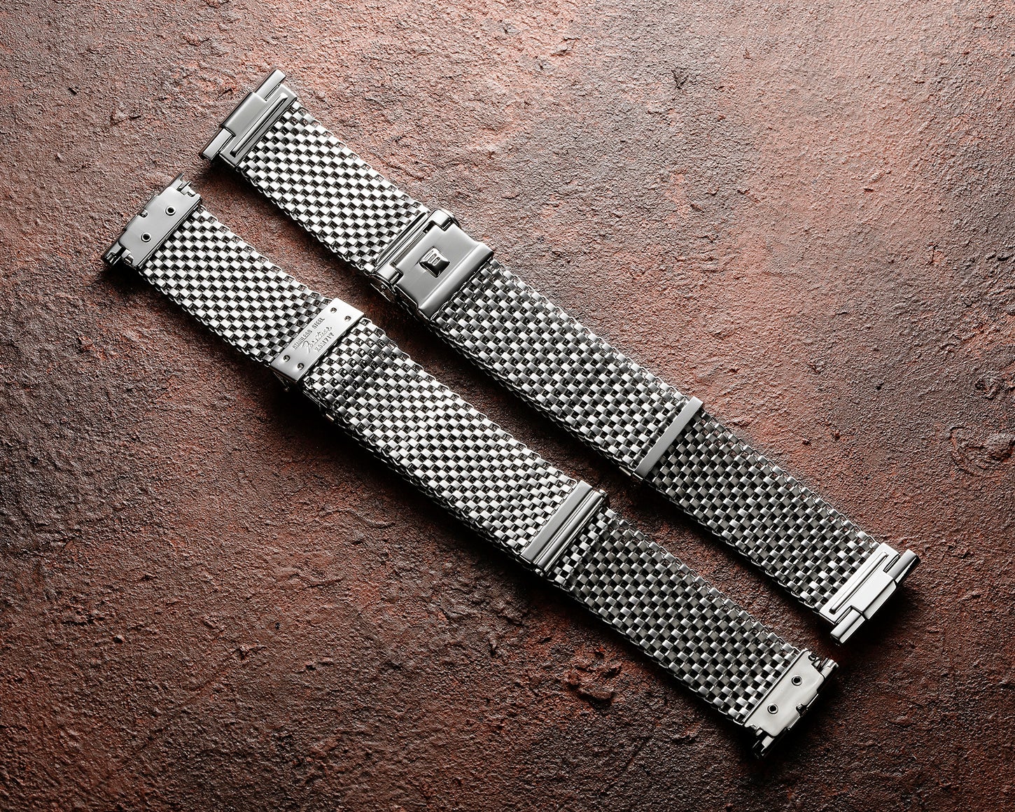 この“シリーズ II ”最大の魅力は、アメリカのブレスレットメーカー、フォースナーとアウトラインとのコラボレーションによって実現した、同社が1939年に開発した歴史的なメッシュブレスレット“コムフィットブレス”を初めて標準装備している点です。そのため通常の時計ブレスレットにはない独特の雰囲気と高級感が楽しめます。