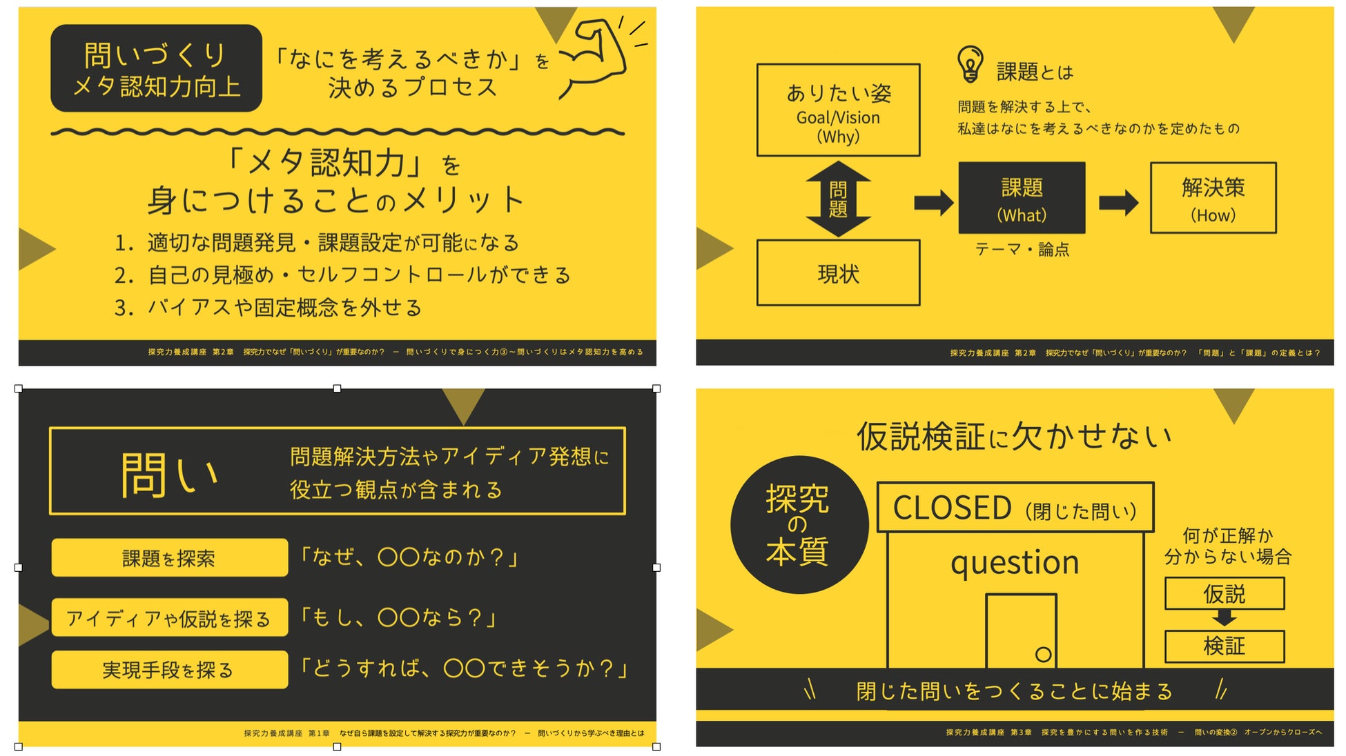 本講座は理論だけでなく、誰でも再現可能な実践的な問いづくりのプロセスに落とし込まれているため、前提知識がなくても簡単に「探究力」と「問題発見力」を習得できます。